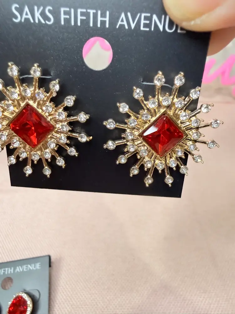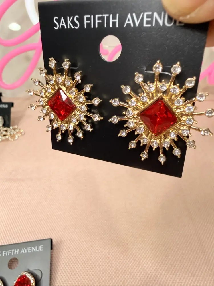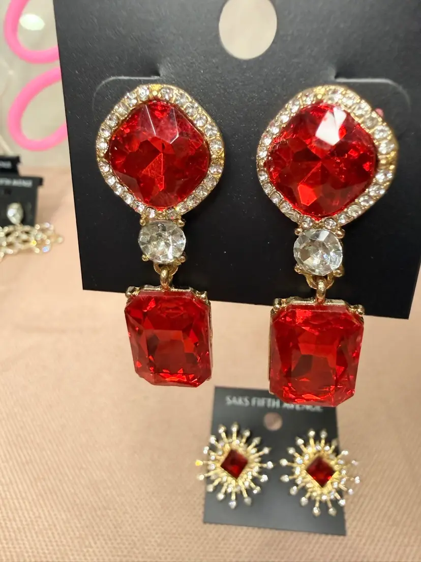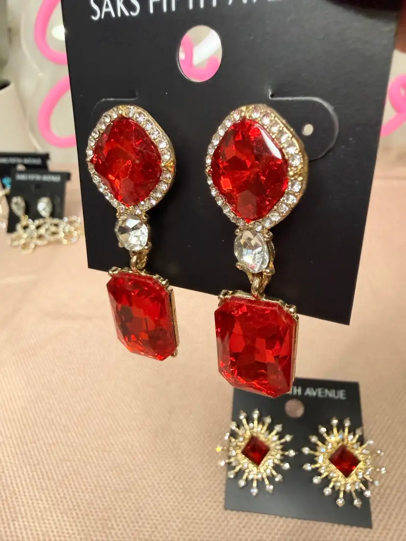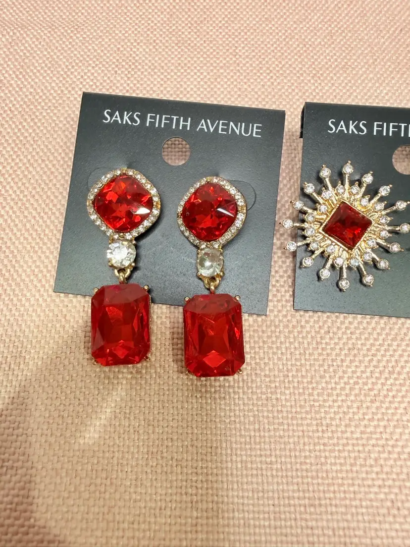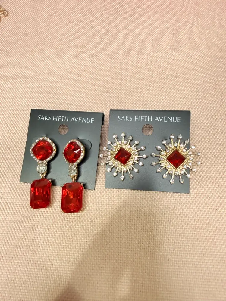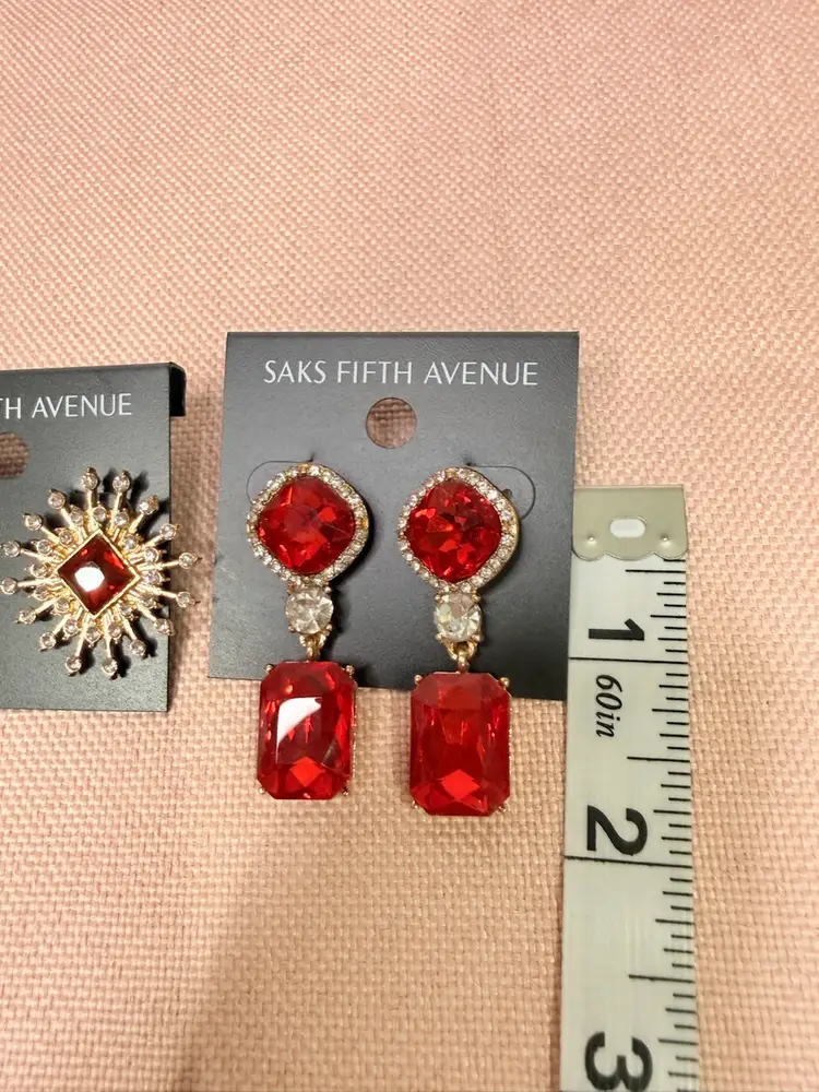2 Pair Saks Fifth Avenue Red Statement Gold Earrings Sparkly Stunning Gift