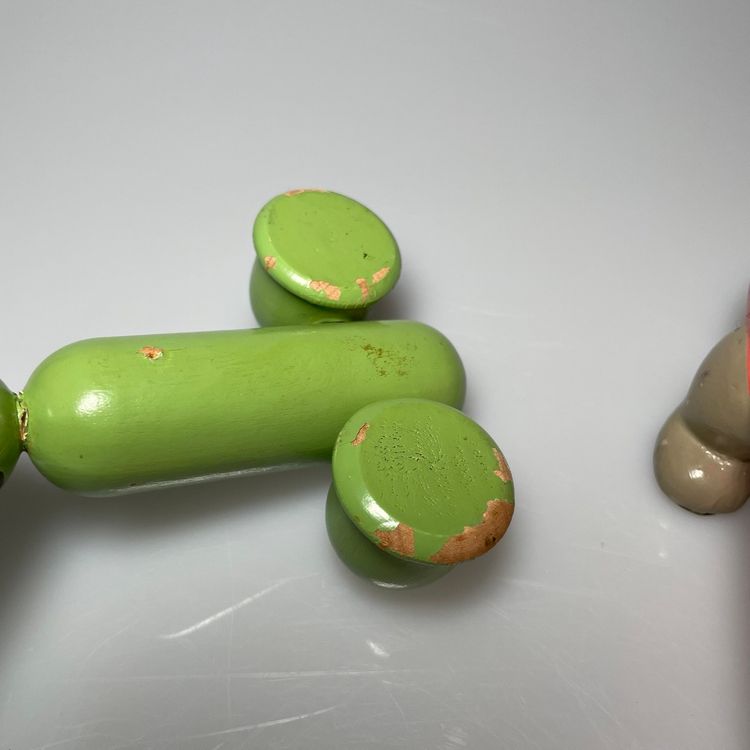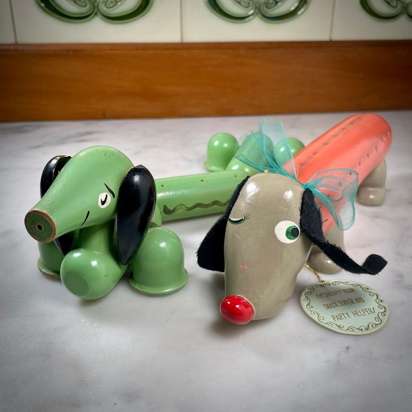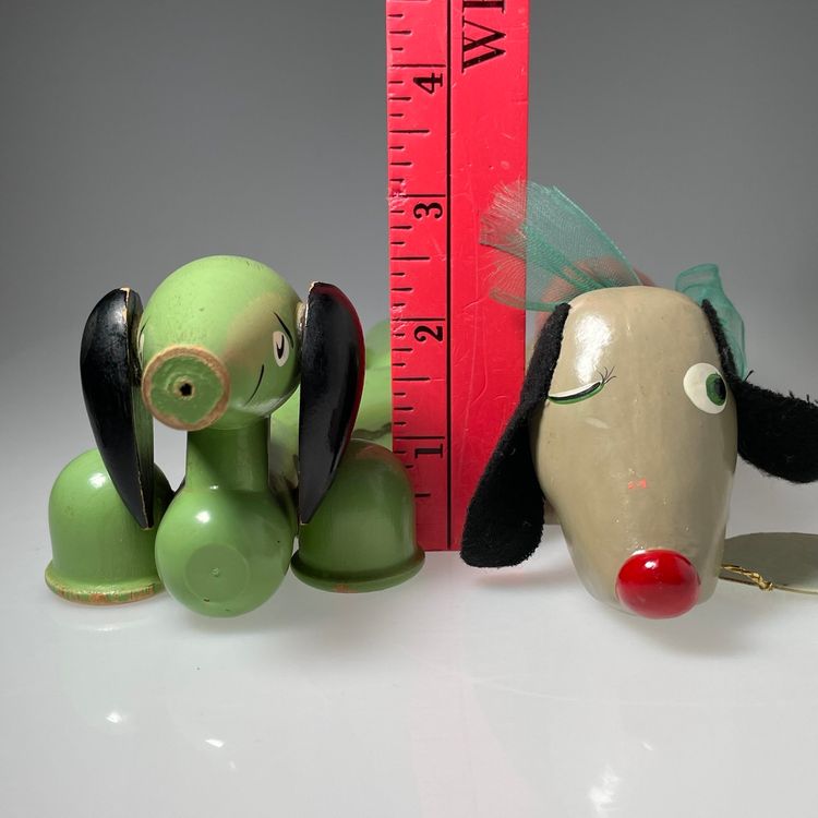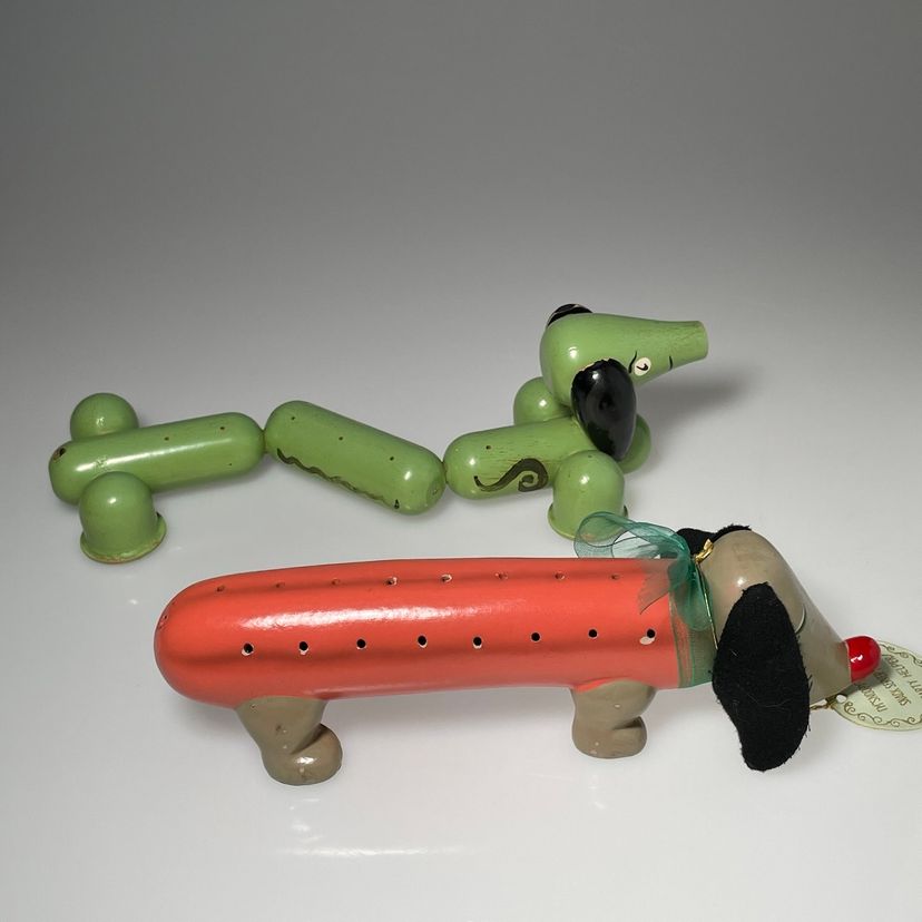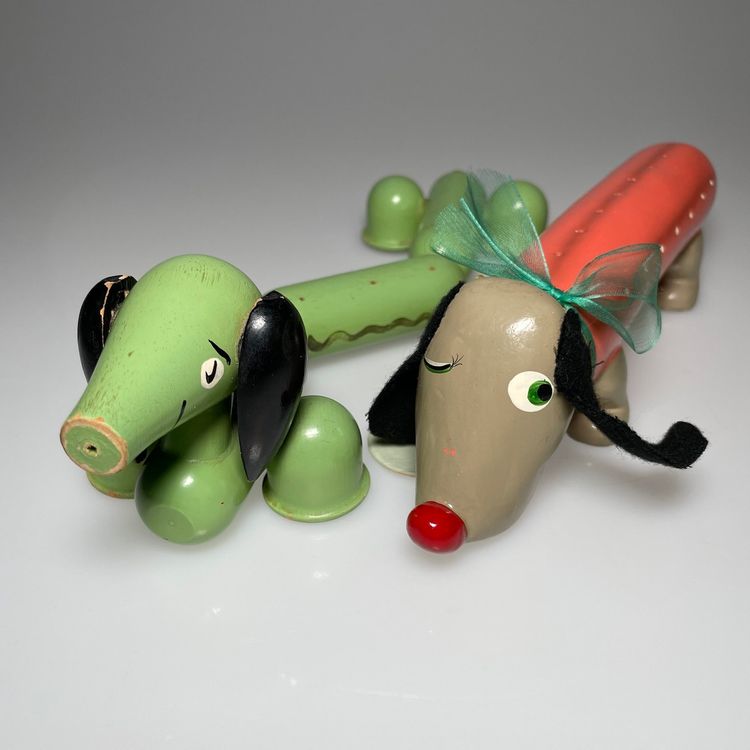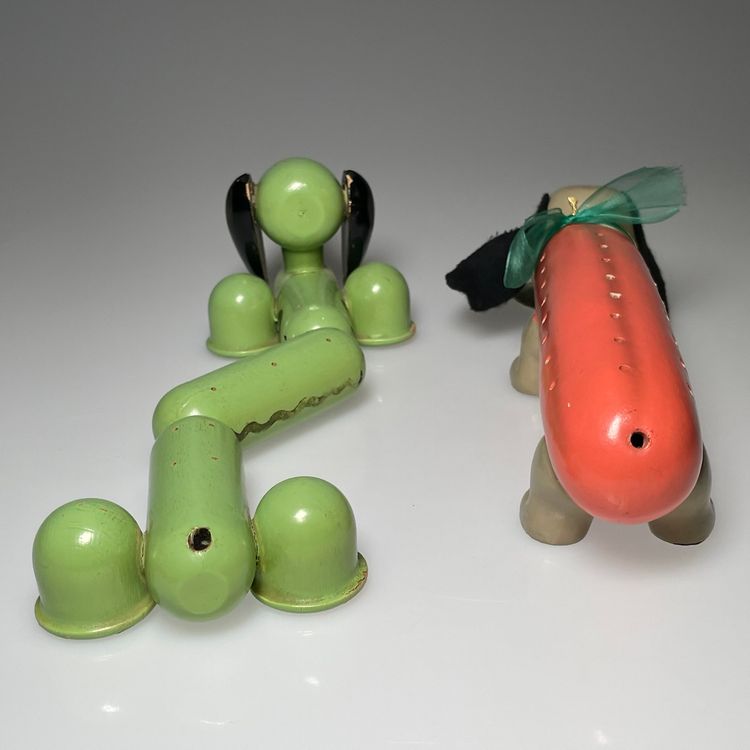 Good Preowned - visible wear and/or minor flaws present. Both are missing their tails. The green dachshund may have had a nose, which if so, is gone. The green one's paint is in rougher shape, but still good condition overall.