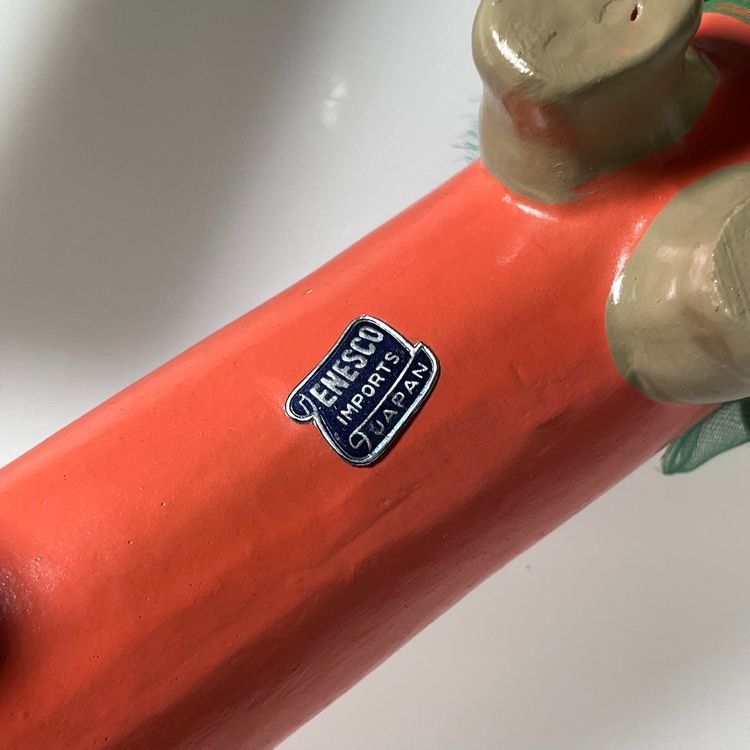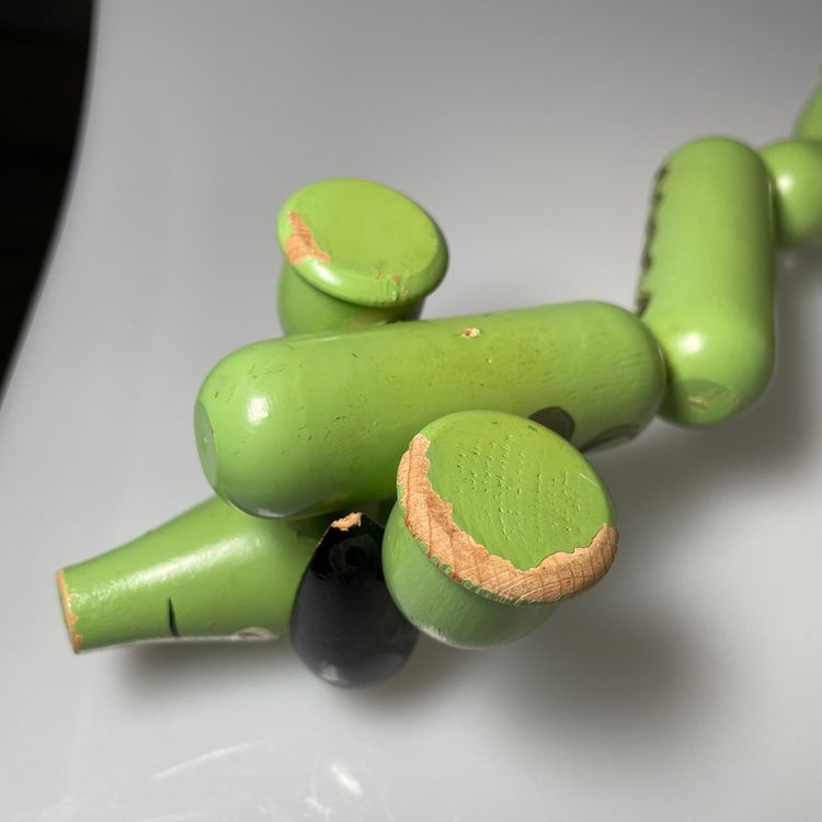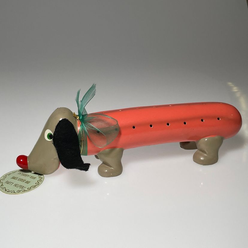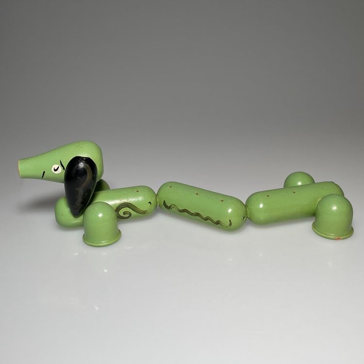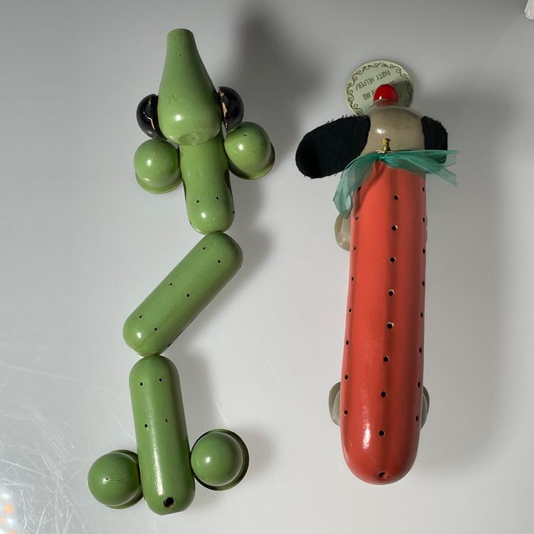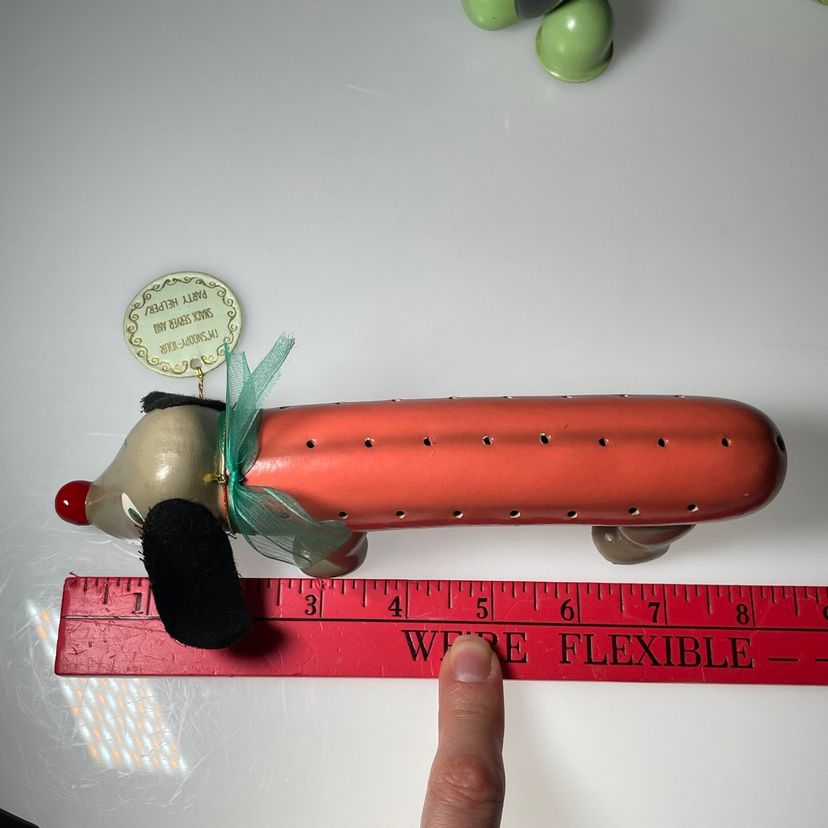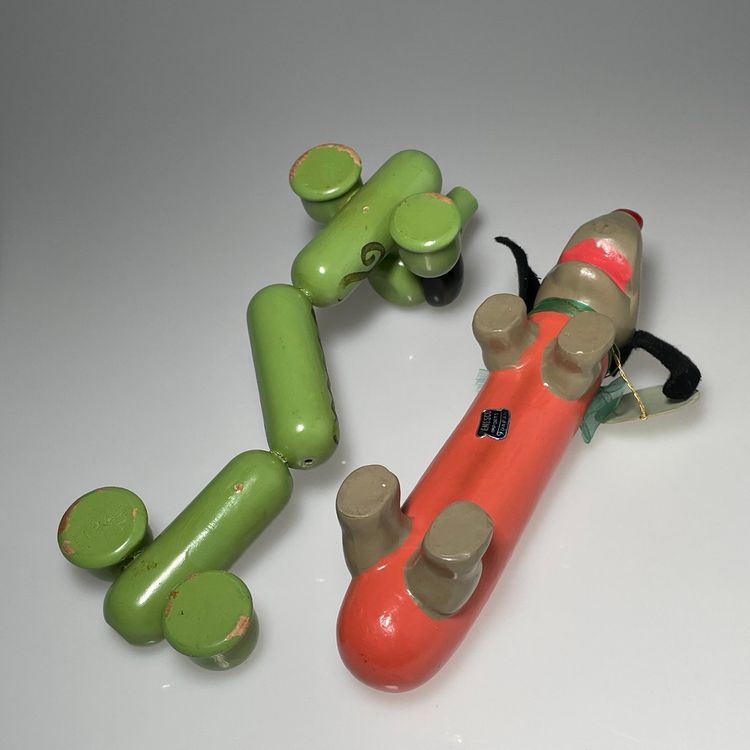 Good Preowned - visible wear and/or minor flaws present. Both are missing their tails. The green dachshund may have had a nose, which if so, is gone. The green one's paint is in rougher shape, but still good condition overall.