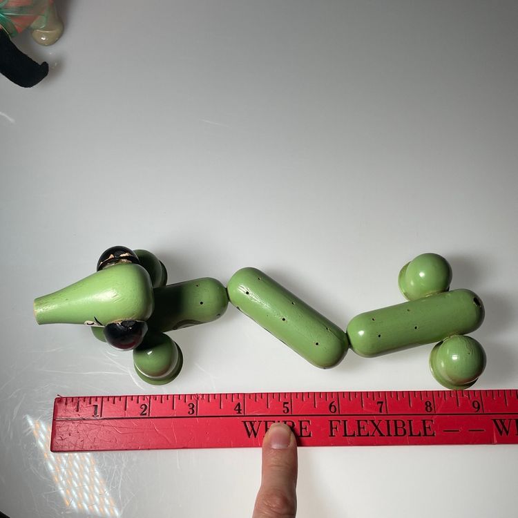 Measurements are approximate: green dog is 9.5 inches long & 2.5 inches tall, pink is 8.25 inches long & 2.25 inches tall