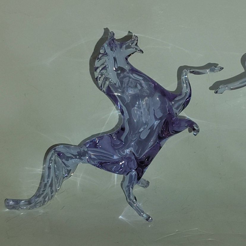 Gorgeous and scarce pieces of Neodymium glass from Murano, Italy! Changes from a lilac purple to a beautiful blue, depending on the light source! 2 Avail, Each Sold Separately. Measure approx. 6.5" long, x 3.5" x 5.75" when in 'rearing position'. Great cond.
