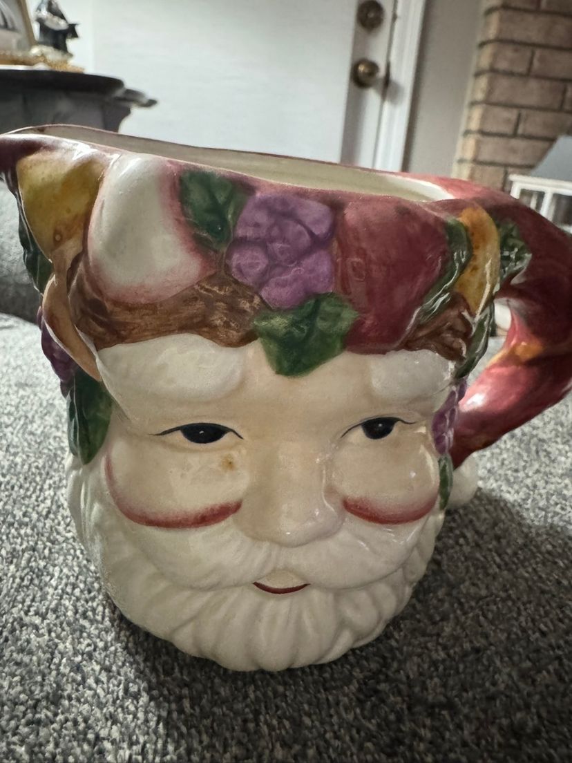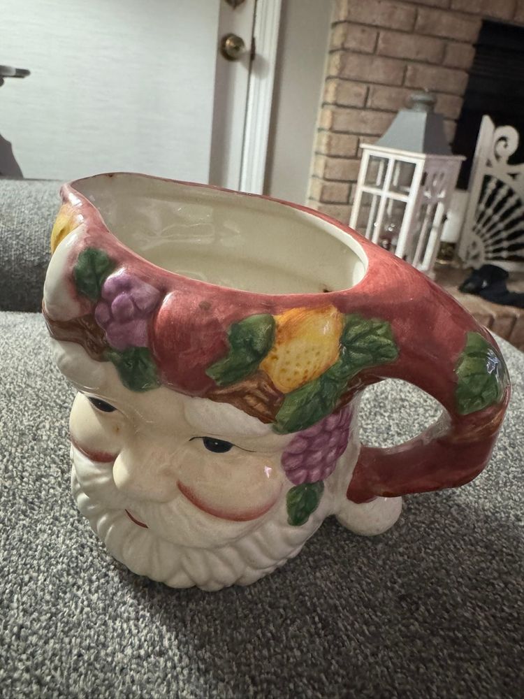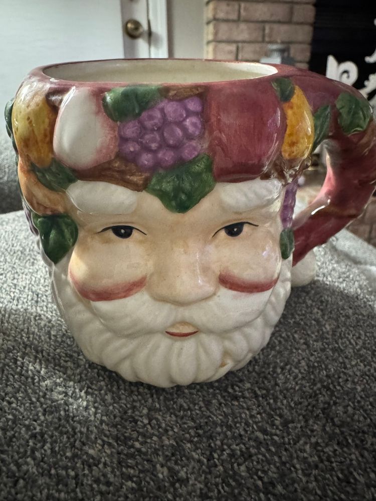 These ceramic mugs feature a three dimensional Santa face with a wreath of fruit, including grapes, pears & other berries, around the topo and handle.