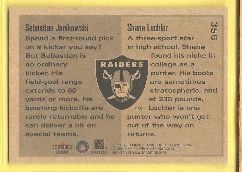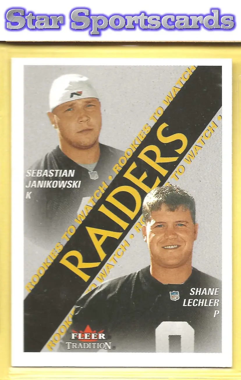 This is a nice example of a 2000 Fleer Tradition #356 Sebastian Janikowski / Shane Lechler .Other important information about this card: RC Rookie In Sebastian Janikowski / Shane Lechler played for the Oakland Raiders.Please check out our other listings for more great cards.