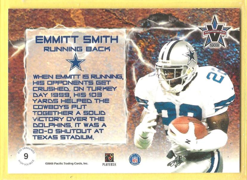 This is a nice example of a 2000 Pacific Vanguard #9 Emmitt Smith High Voltage .Other important information about this card: In Emmitt Smith played for the Dallas Cowboys.Please check out our other listings for more great cards.