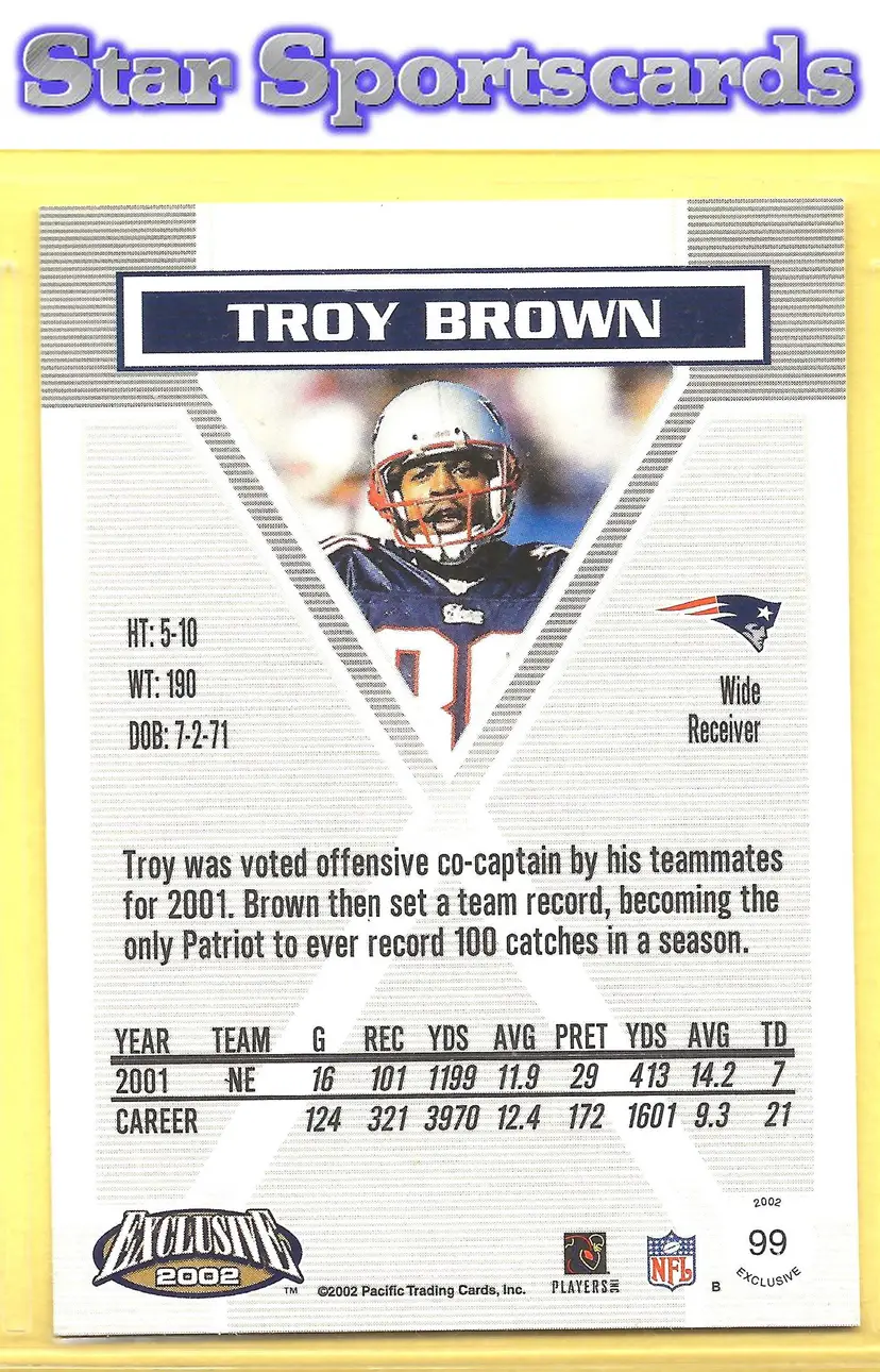 This is a nice example of a 2002 Pacific Exclusive #99 Troy Brown Gold .Other important information about this card: In Troy Brown played for the New England Patriots.Please check out our other listings for more great cards.