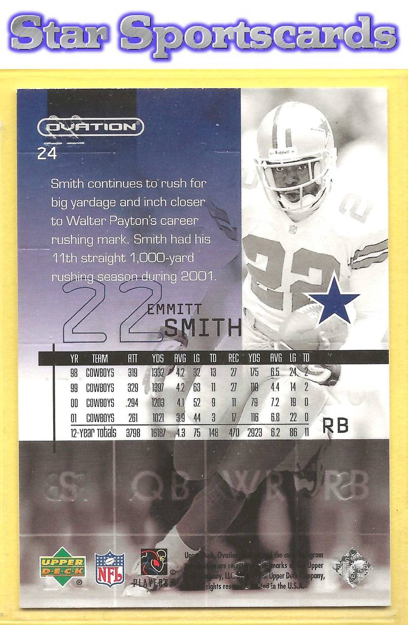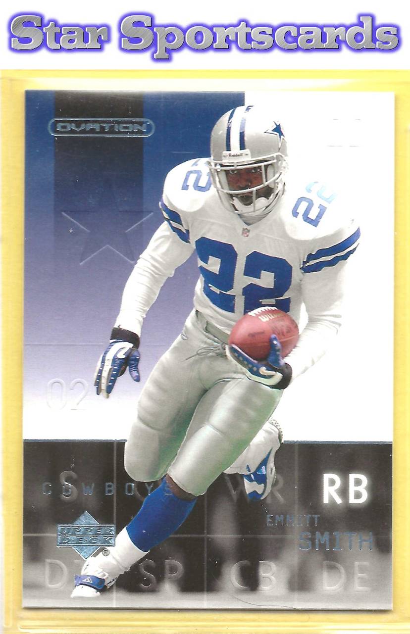 This is a nice example of a 2002 Upper Deck Ovation #24 Emmitt Smith .Other important information about this card: In Emmitt Smith played for the Dallas Cowboys.Please check out our other listings for more great cards.