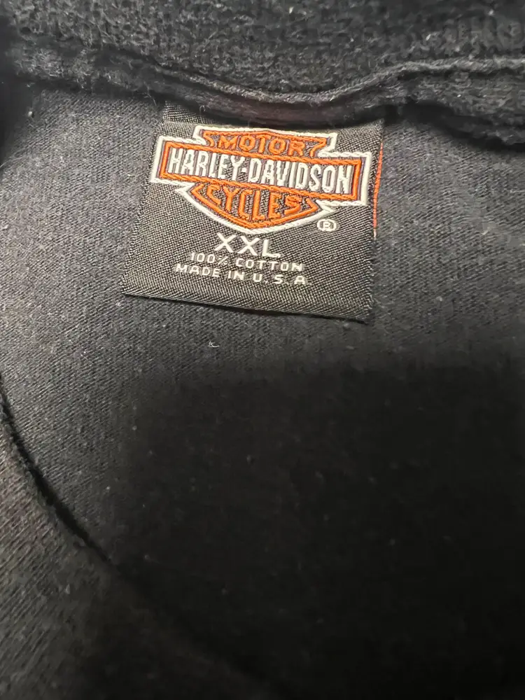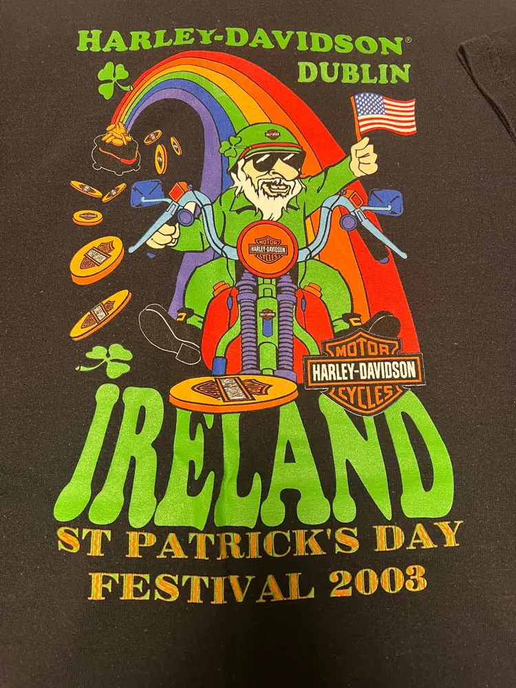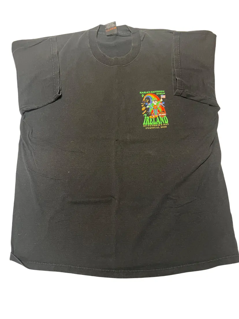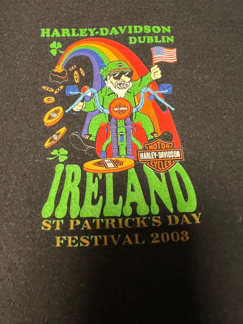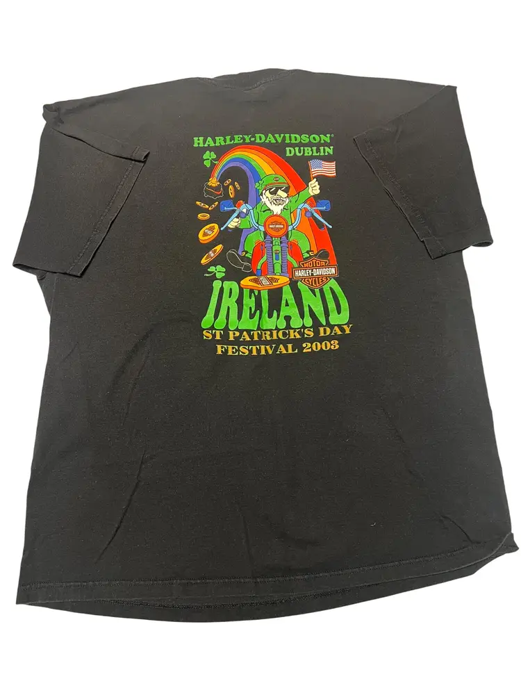 Original 2003 Harley-Davidson Dublin, Ireland St. Patrick’s Day Festival T-shirt. Tag XXL, Made in USA 100% cotton. Bright front chest hit and large back graphic with leprechaun, rainbow, and Harley logos. Approximately 29.5" L x 23.75" P2P. Ready to wear or add to a Harley shop tee collection.