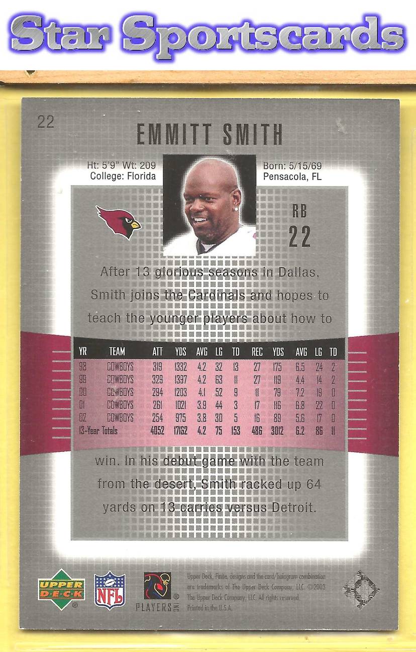 This is a nice example of a 2003 Upper Deck Finite #22 Emmitt Smith #/2350 .Other important information about this card: SN In Emmitt Smith played for the Arizona Cardinals.Please check out our other listings for more great cards.