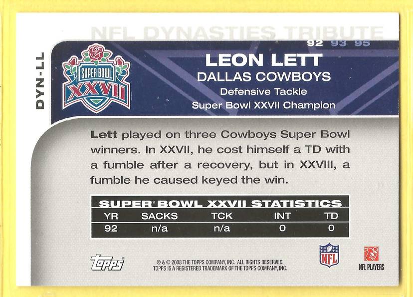This is a nice example of a 2008 Topps #DYN-LL Leon Lett NFL Dynasties Tribute .Other important information about this card: In Leon Lett played for the Dallas Cowboys.Please check out our other listings for more great cards.