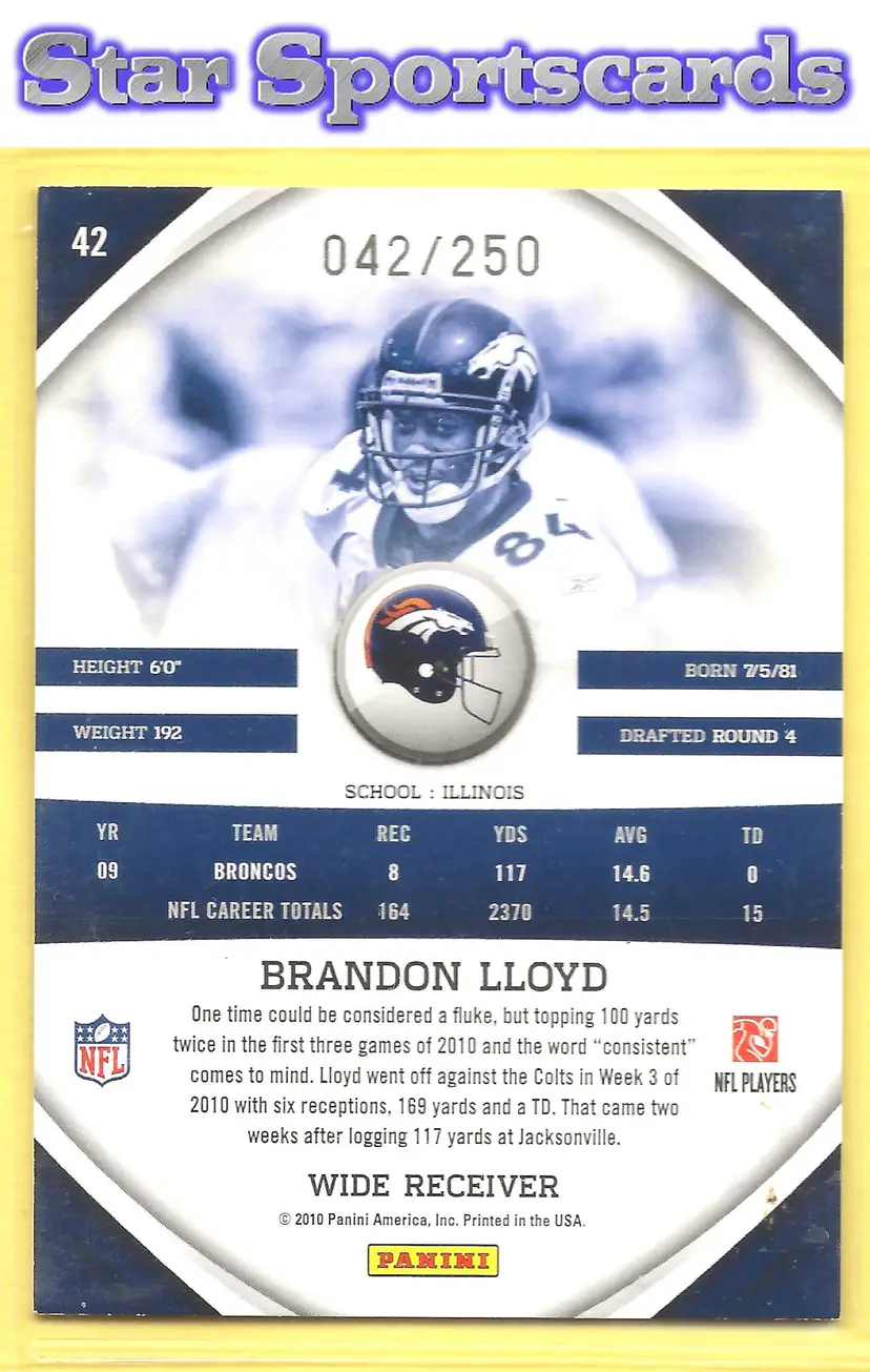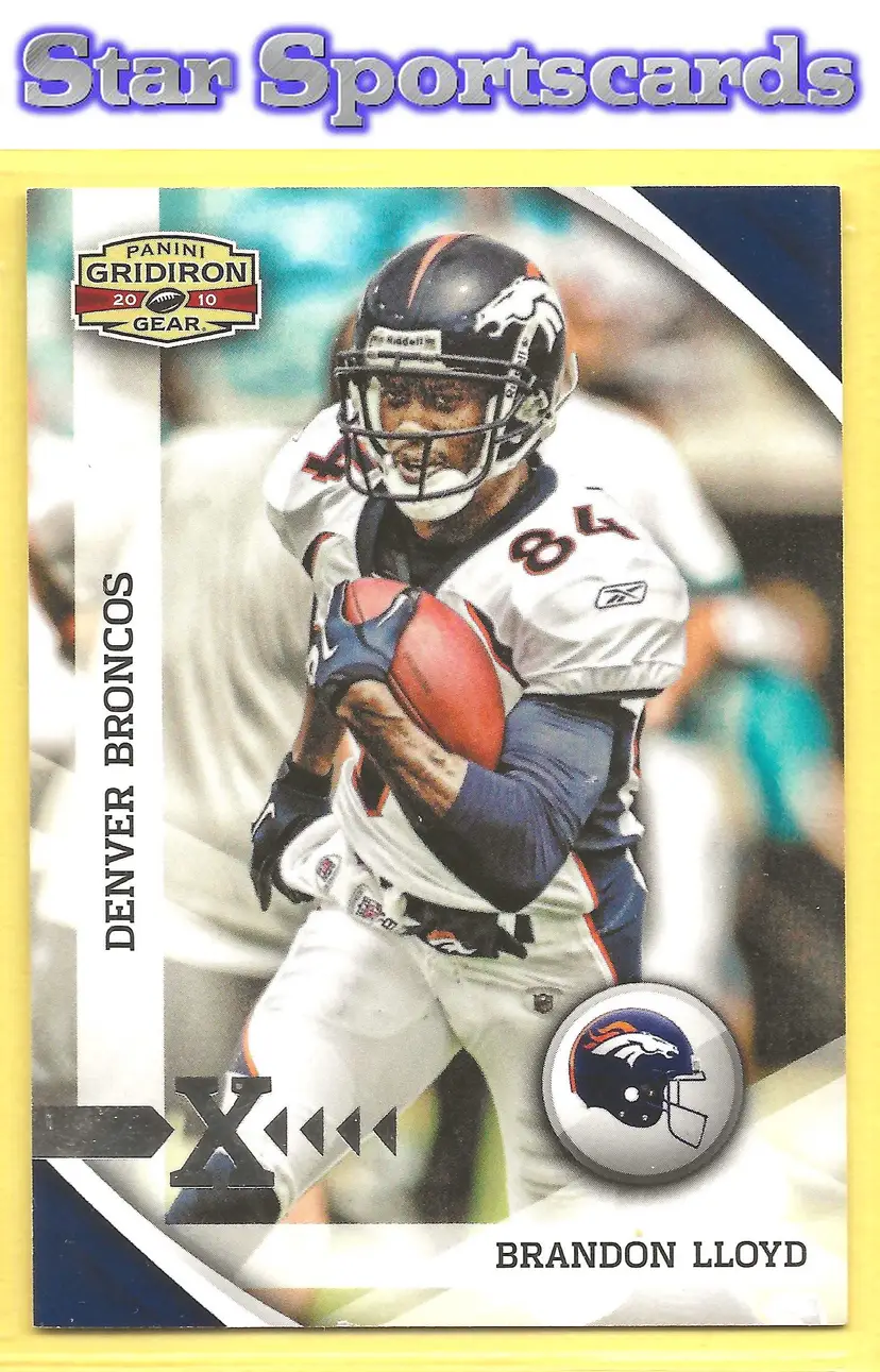 This is a nice example of a 2010 Panini Gridiron Gear #42 Brandon Lloyd Silver X's #/250 .Other important information about this card: SN In Brandon Lloyd played for the Denver Broncos.Please check out our other listings for more great cards.