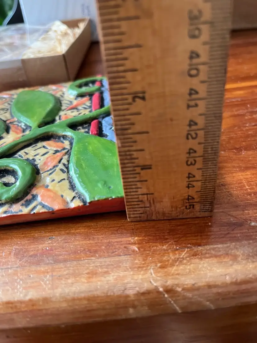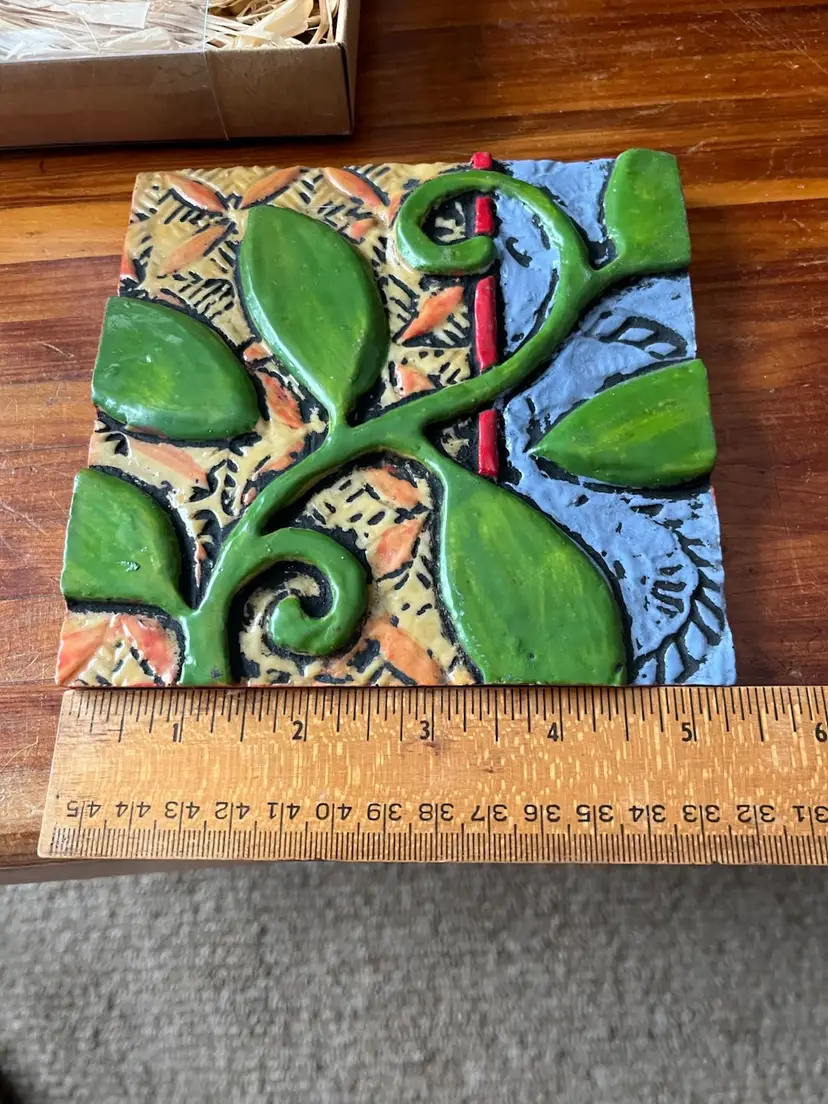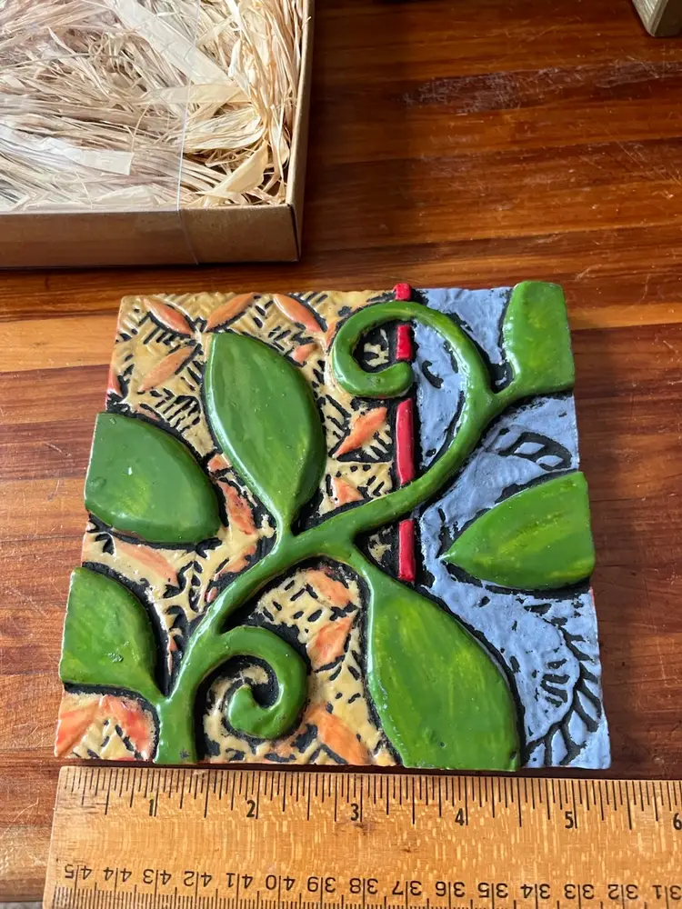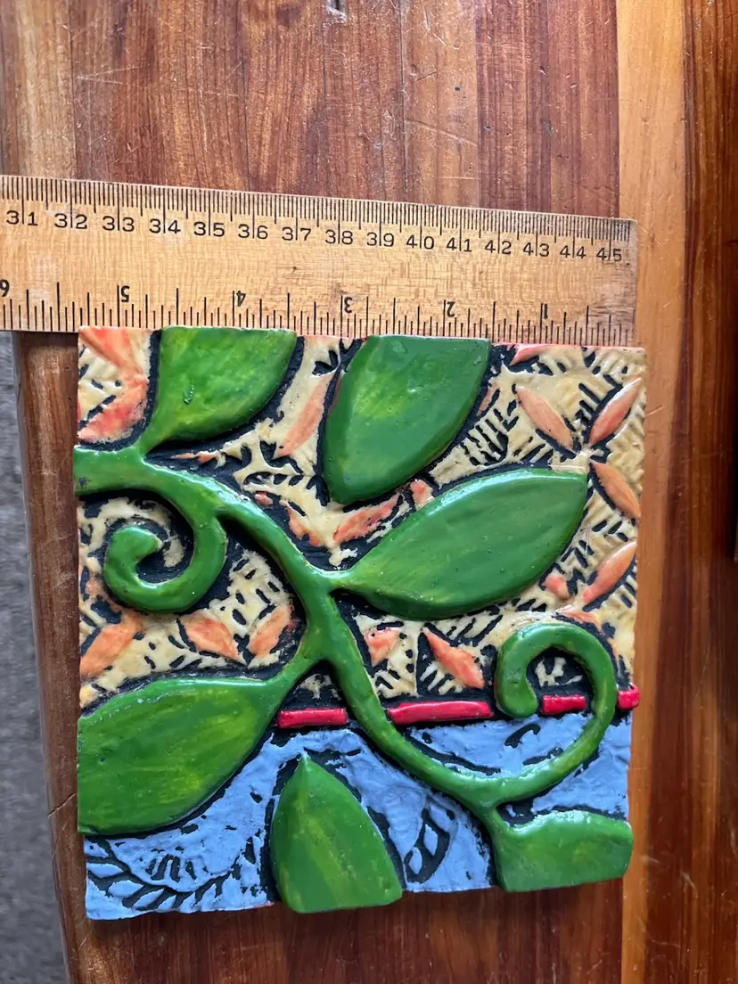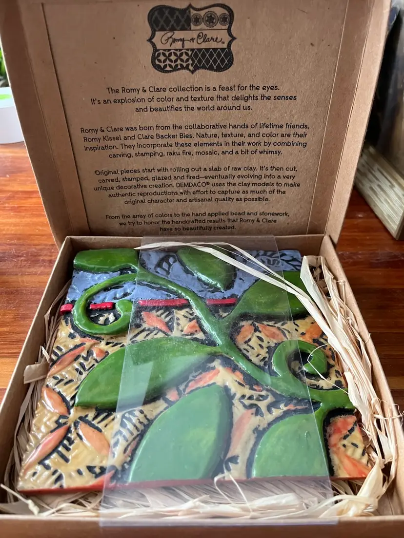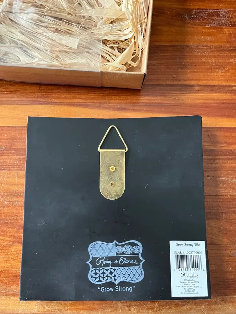 The 2014 Romy & Clare Grow Strong Hanging Decorative Tile is a whimsical and colorful piece perfect for a garden-themed decor. Created by artists Romy Kissel & Clare Backer Bies, this square-shaped tile features a playful bean stalk pattern in vibrant, multicolor hues. Made of resin and measuring 5.5" in length and height, this medium-sized tile is suitable for wall mounting and adds a touch of artisanal charm to any space. Ideal for teens and adults, this boho-styled decorative tile is easy to care for and sure to brighten up any room with its whimsical design.