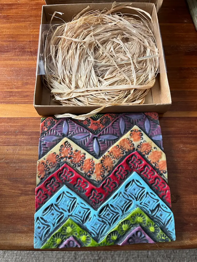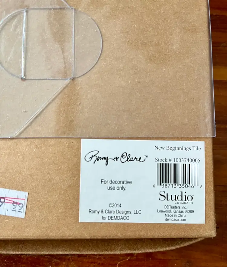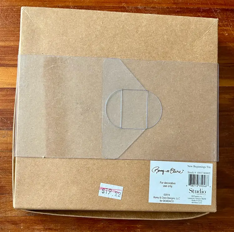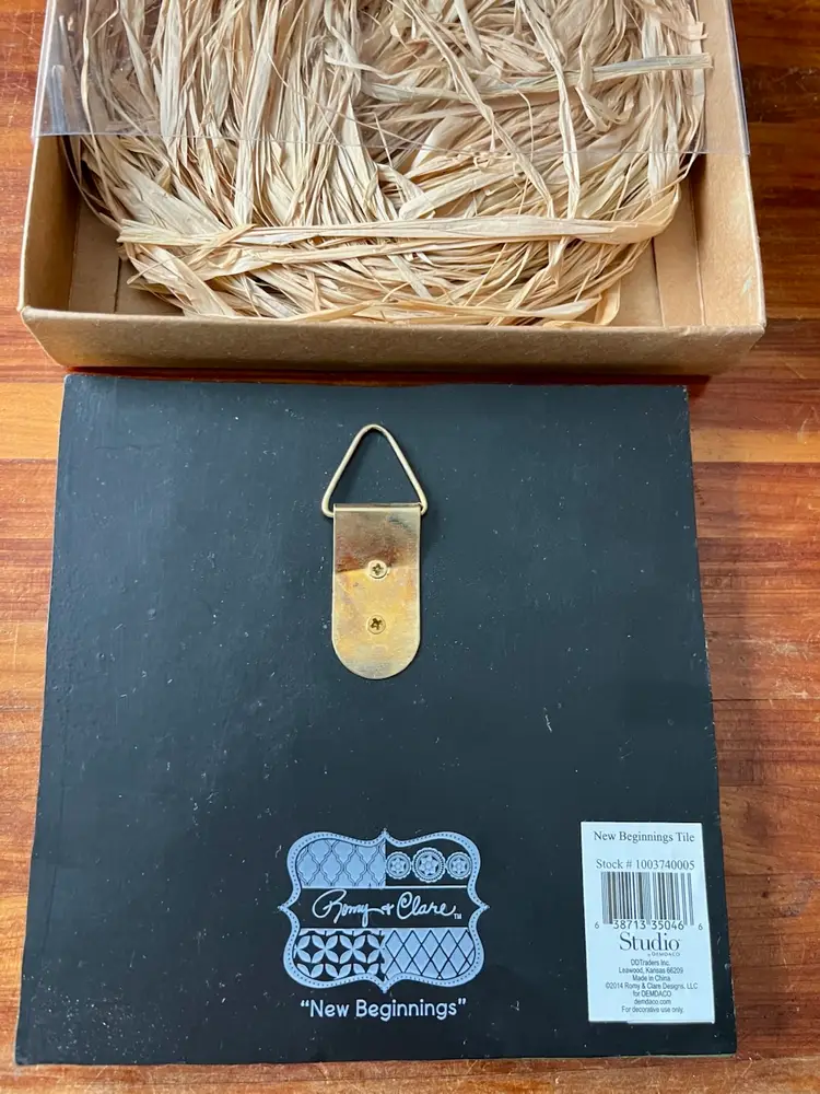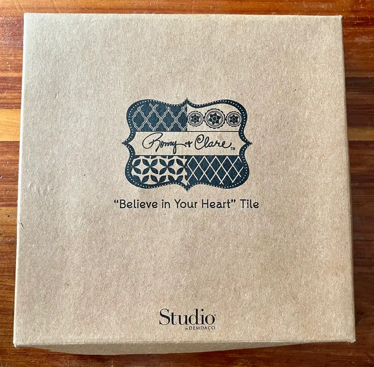 The 2014 Romy & Clare New Beginnings in a box with “Believe In Your Heart” on its cover Hanging Decorative Tile is a unique and colorful piece suitable for all occasions. With a square shape and a medium size of 5.5 inches in length and height, this boho style tile features a whimsical chevron layered, stamped pattern, perfect for adding a touch of artisanal charm to any wall. Made of resin, this licensed reproduction was manufactured in China and weighs 15 ounces in the box. Easy to care for, this decorative tile is a delightful addition to any space seeking a vibrant and colorful theme.