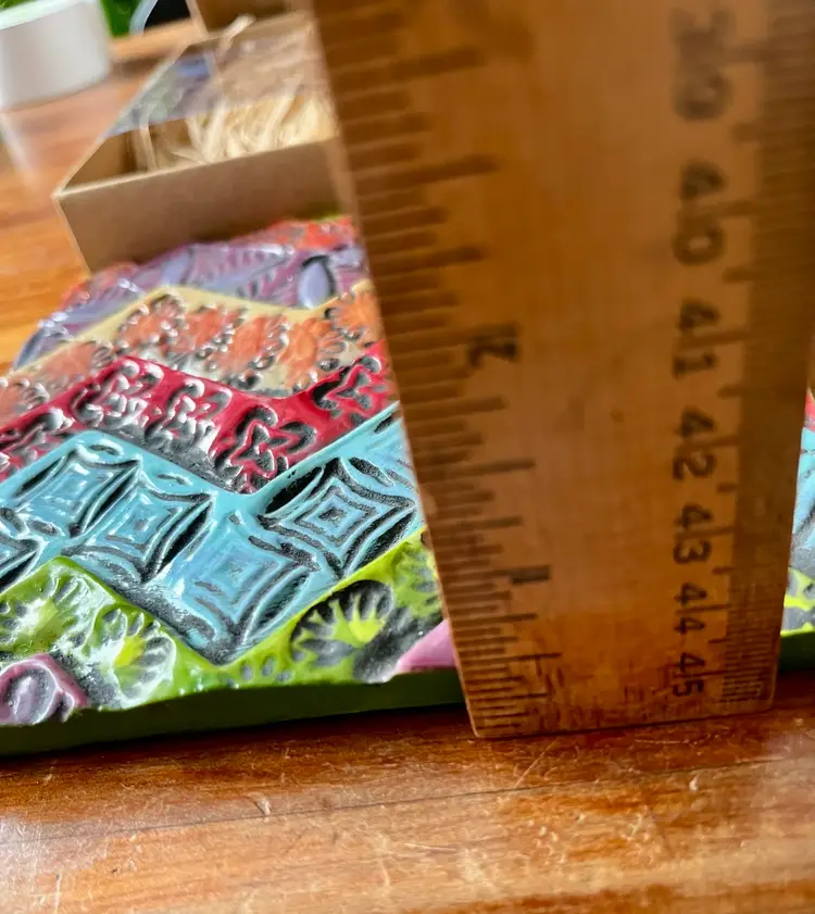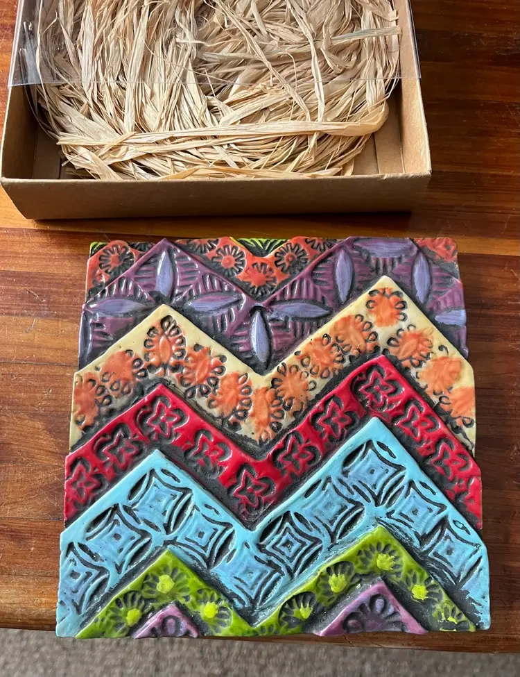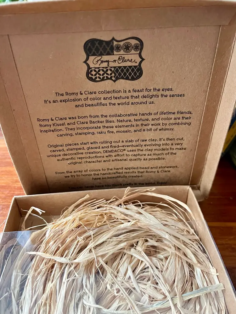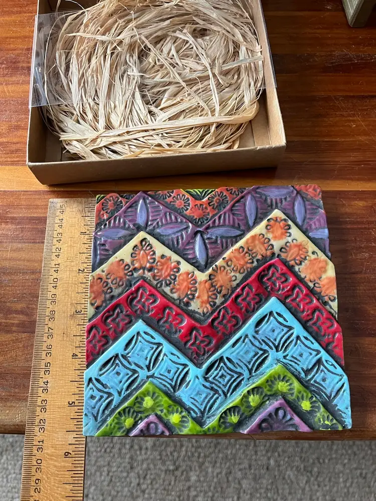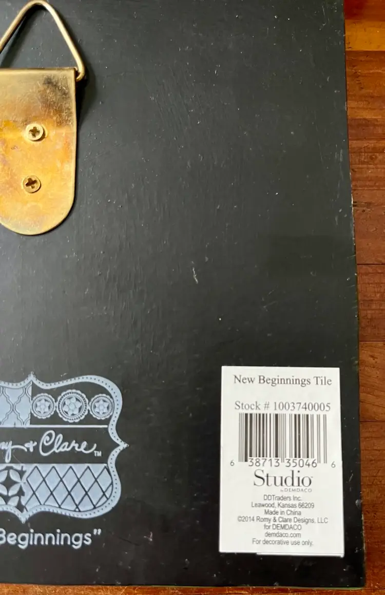 The 2014 Romy & Clare New Beginnings in a box with “Believe In Your Heart” on its cover Hanging Decorative Tile is a unique and colorful piece suitable for all occasions. With a square shape and a medium size of 5.5 inches in length and height, this boho style tile features a whimsical chevron layered, stamped pattern, perfect for adding a touch of artisanal charm to any wall. Made of resin, this licensed reproduction was manufactured in China and weighs 15 ounces in the box. Easy to care for, this decorative tile is a delightful addition to any space seeking a vibrant and colorful theme.