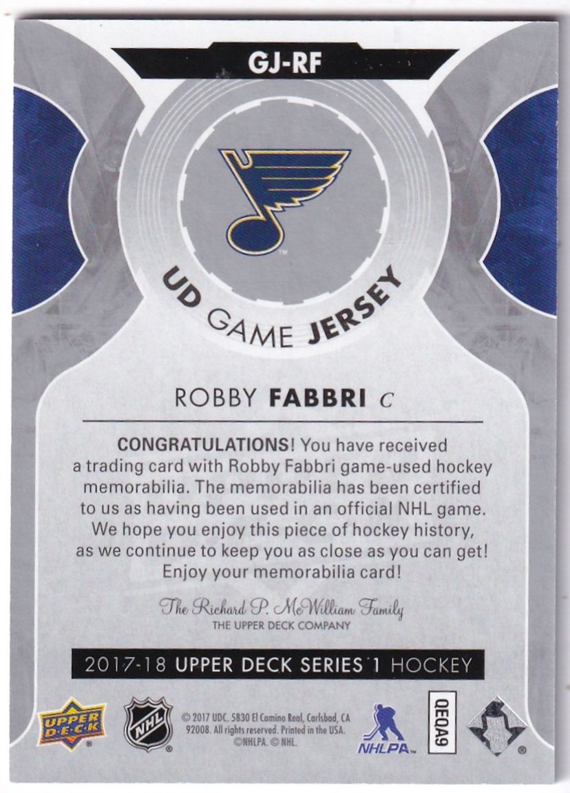 2017-18 Upper Deck Game Jerseys #GJRF Robby Fabbri St. Louis Blues