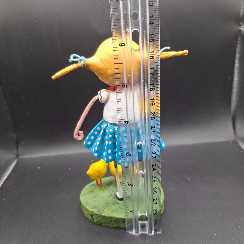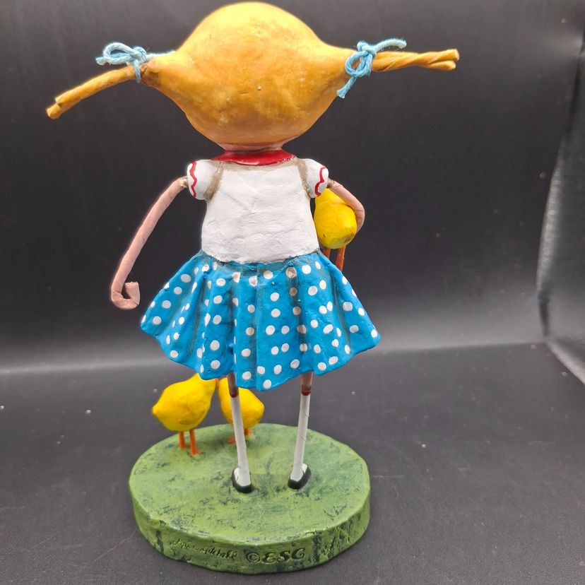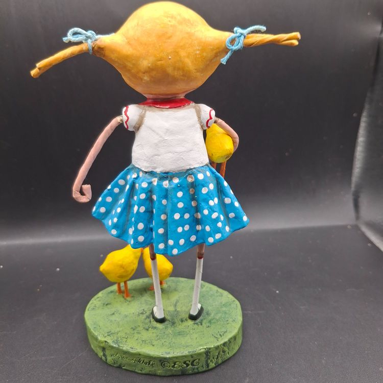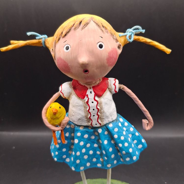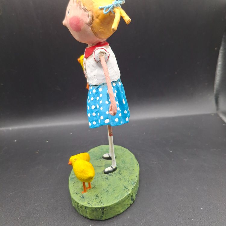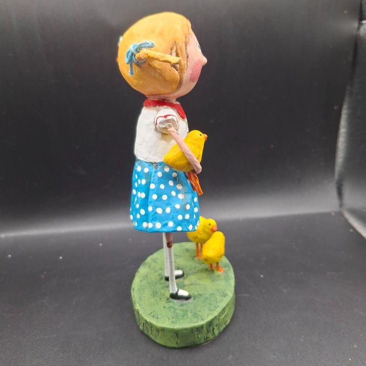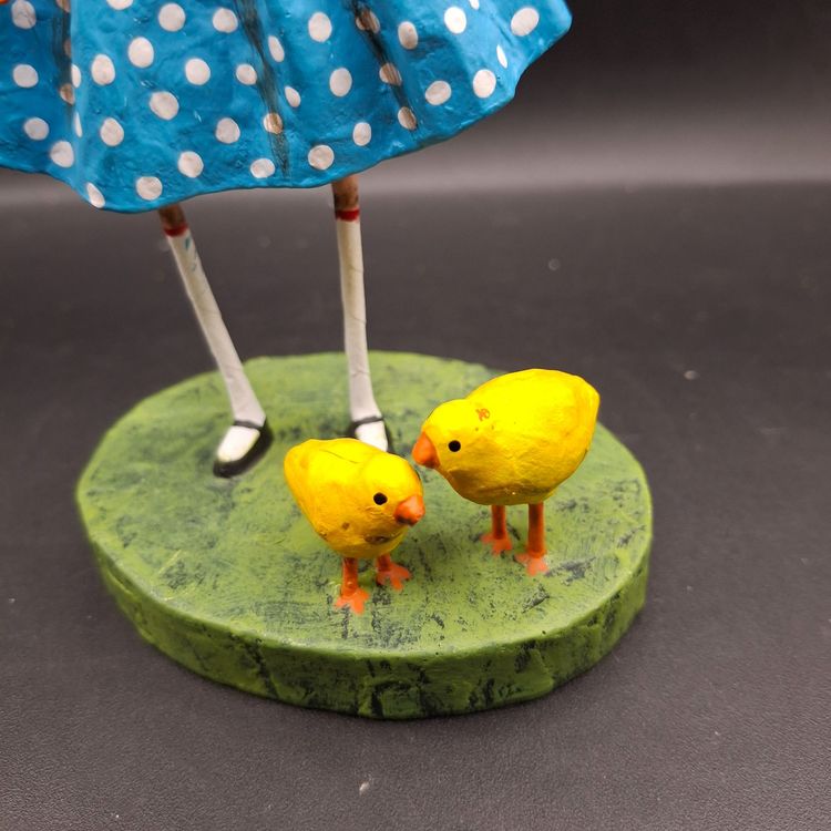 In a whimsical world where imagination knows no bounds, a young girl stands with her chicks by her side. She's dressed in a charming blue polka dot skirt, evoking the innocence of childhood. Each chick captures a moment of wonder and curiosity. Crafted with care, this figurine tells a story of friendship and the simple joys of life.