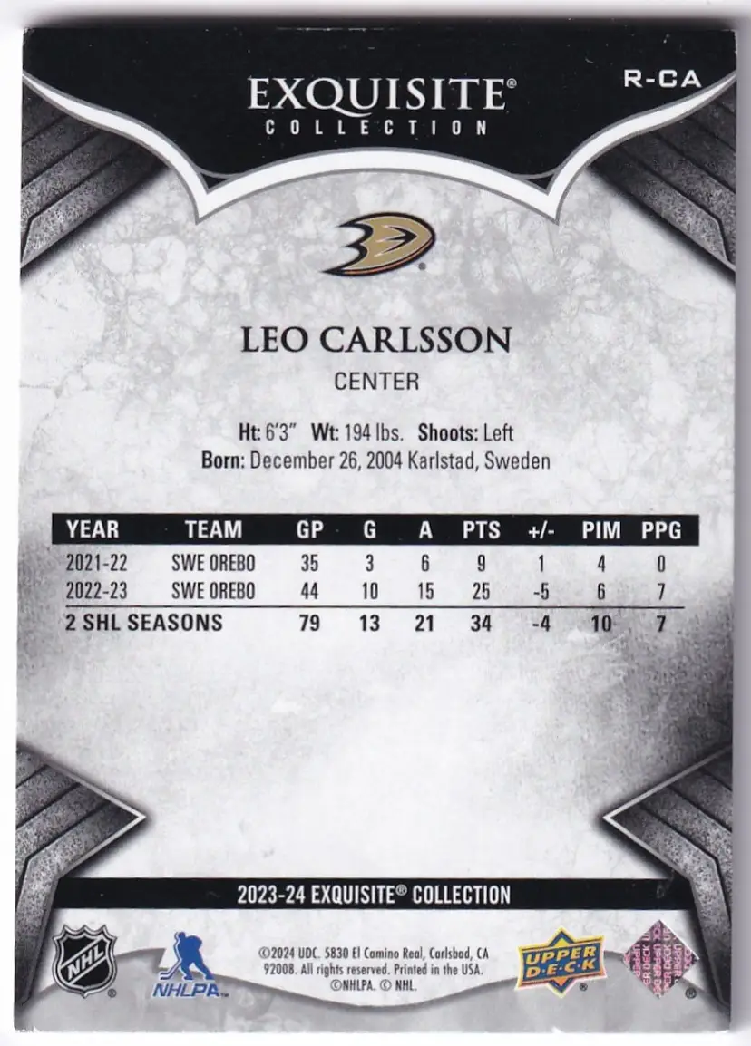 2023-24 Exquisite Collection #RCA Leo Carlsson RC Anaheim Ducks Print Run - 399