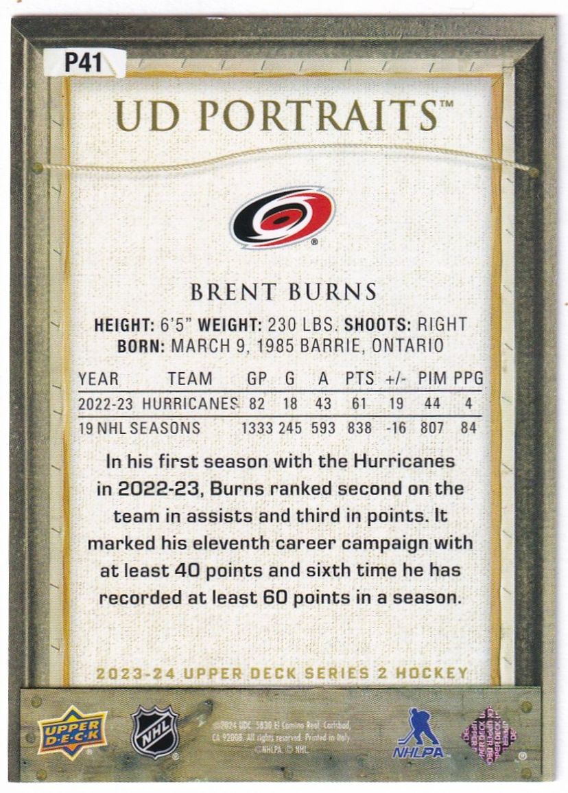 2023-24 Upper Deck UD Portraits #P41 Brent Burns Carolina Hurricanes