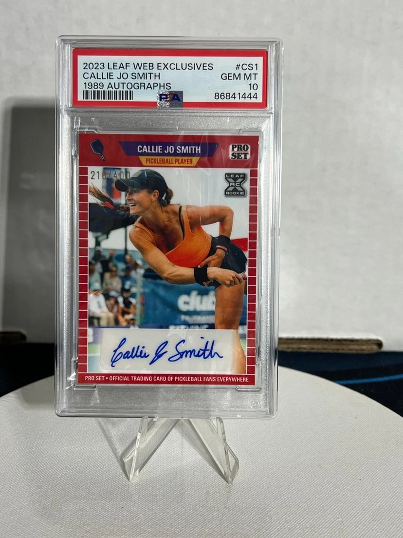 The 2023 Leaf Pickleball CALLIE JO SMITH Signed AUTOGRAPH Card is a limited edition sports trading card featuring an autograph from the player, Callie Jo Smith. The card is professionally authenticated by Professional Sports Authenticator (PSA) and is encased in a tamper-resistant seal for protection. This online exclusive card is part of a timed release and has a card number of 216 out of 400 produced, making it a highly sought-after collectible for fans of pickleball and collectors of sports trading cards.