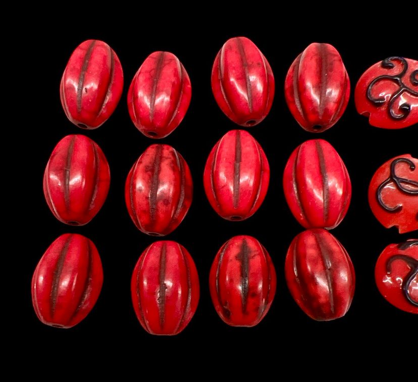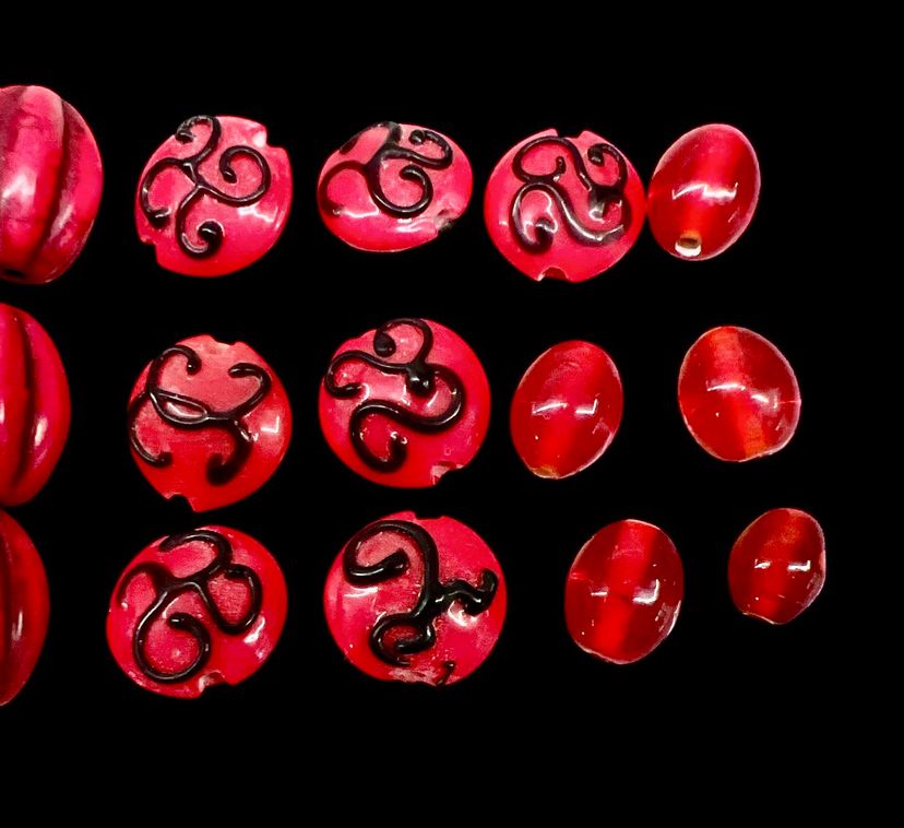 24 Loose Vintage Lampwork & Czech Glass Beads Deep Red Color Black Design