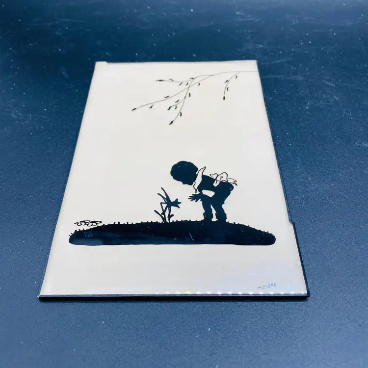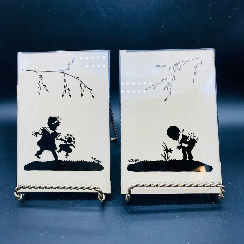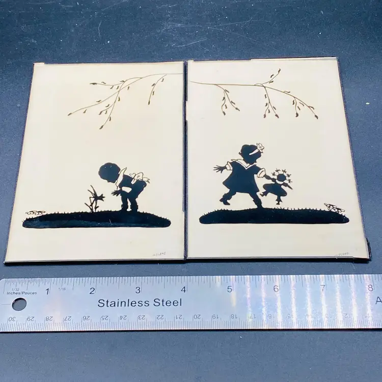 This vintage pair of reverse painted glass silhouettes features a boy picking a flower and girl holding doll and dressed in Victorian style clothing. The black oainting on glass with a cream background adds a touch of elegance to this original artwork, which dates back to the 1900-1940 era. Hand Crafted, this decorative collectible is a unique addition to any home. Its intricate details and charming features make it a true masterpiece. Perfect for collectors of vintage art or those looking to add a touch of historical charm to their space.