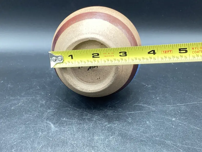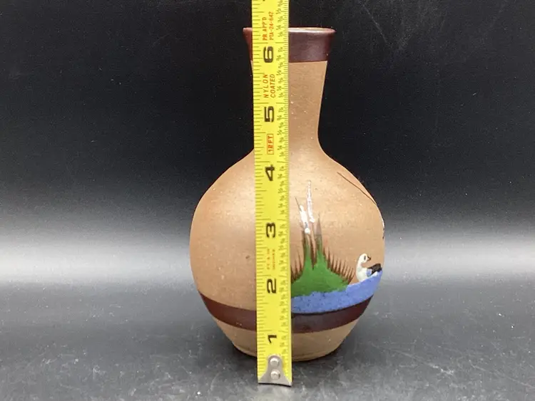 This Tanala vase features birds on a pond. It measures 6 1/4 inches tall and approximately 4 inches across the widest portion. The opening at the top is one and 3/4 inches. There are no chips, cracks or fleas. The piece is signed on the bottom. Please see pictures for a complete description, measurements and condition.
