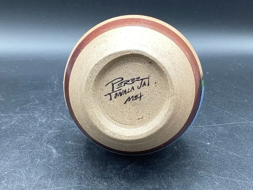 2439-Tonala Vase With Birds, Signed Perez, Mexico, 6.25 Inches Tall