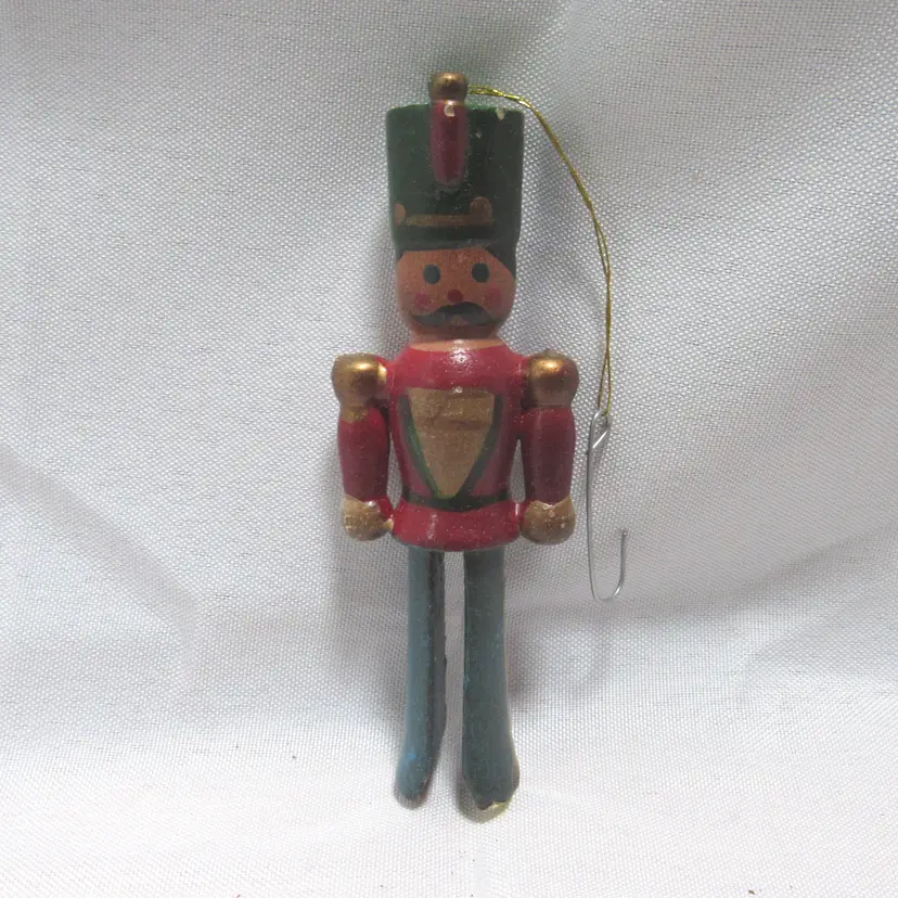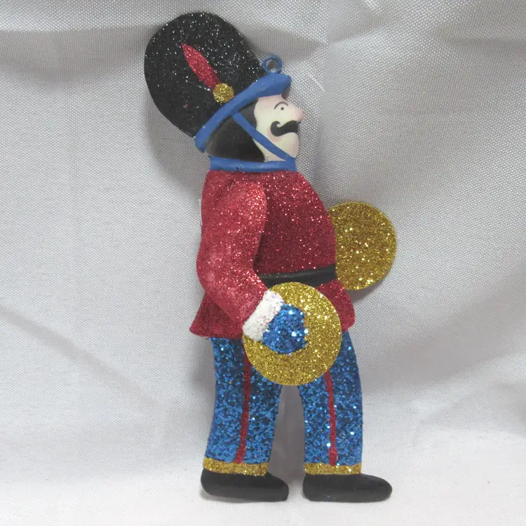 Wooden Clothespin Toy Soldier. Approx 4.25" long. Can hang or push over a branch Bombay Co. Metal Soldier w/Cymbals. Approx 6.5". Made in Phillipines. Covered w/Glitter Uncle Sam, flat tin Aprrox 4 3/4" long