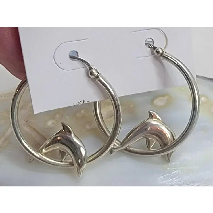 Sterling dolphin hoop earrings. The hoops are 1” in diameter. Excellent pre-owned condition.