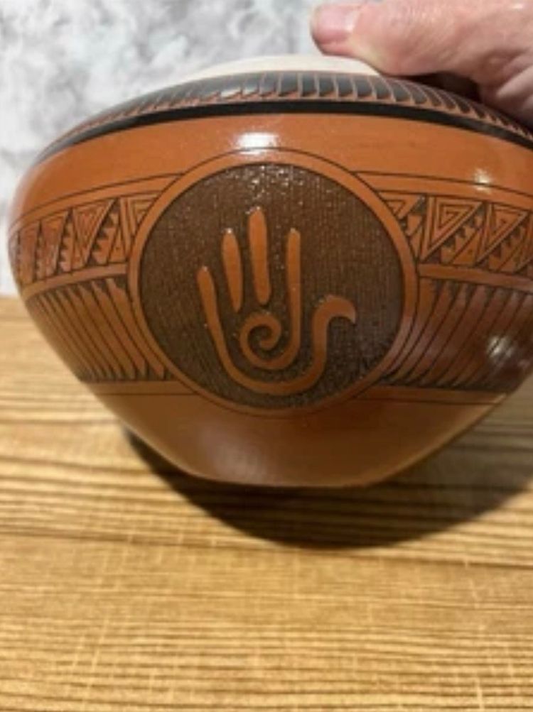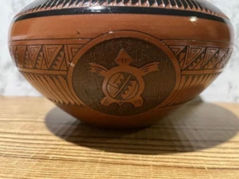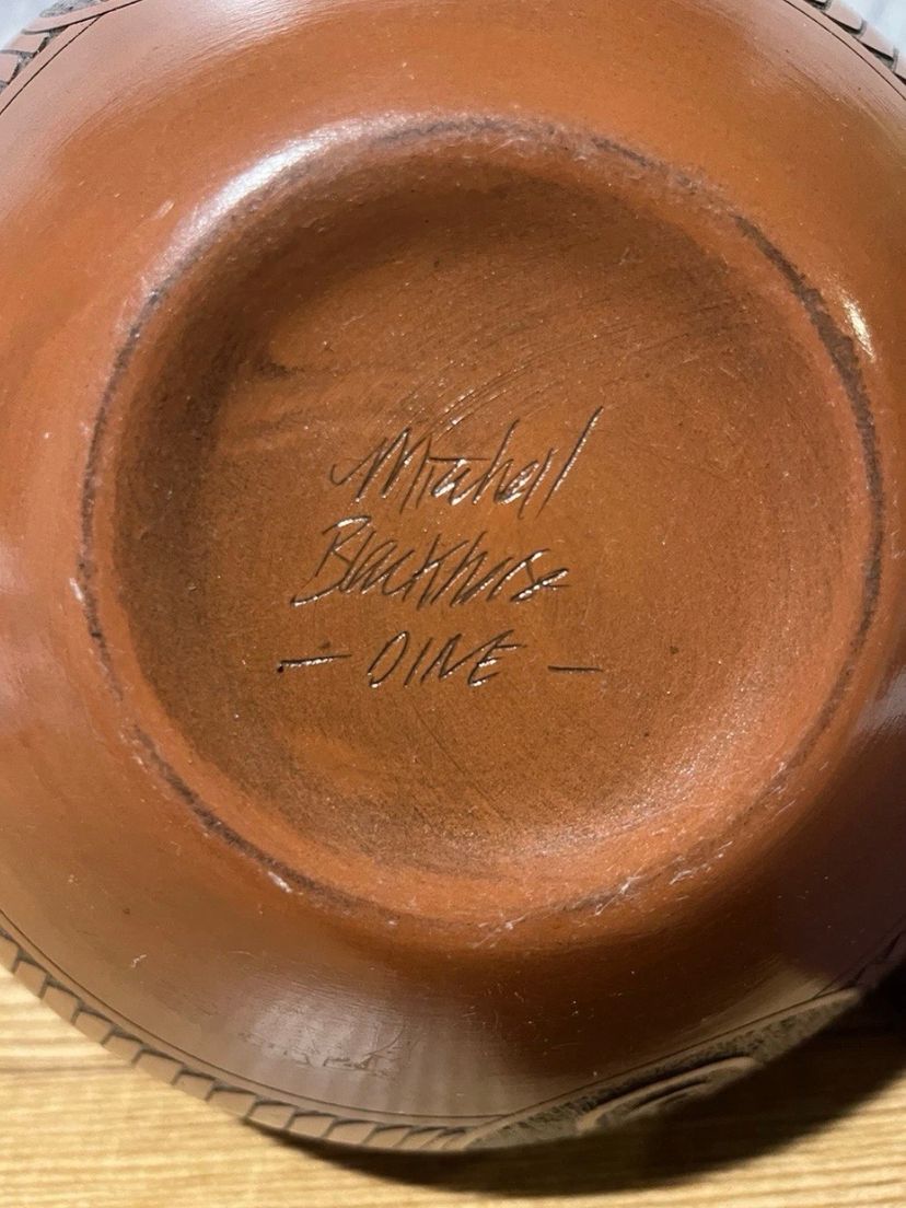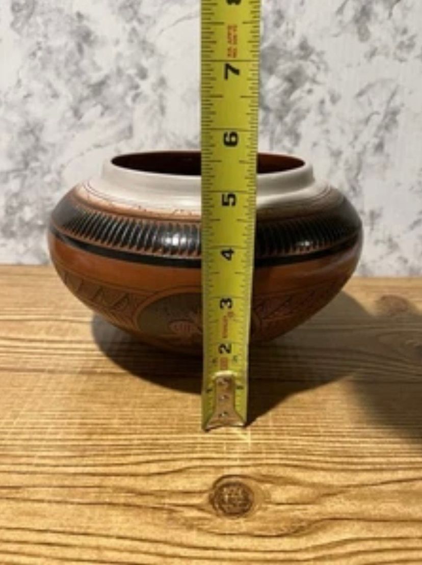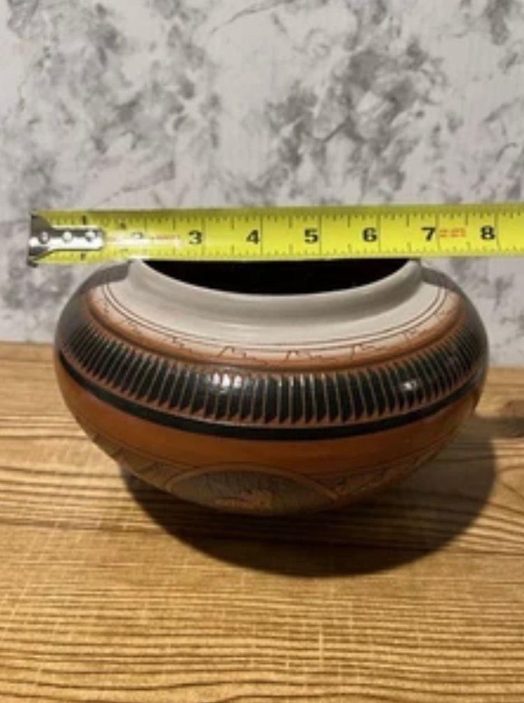 This Vase is a beautifully handmade piece of Navajo art by artist Mitchell Blackhorse. This Native American pottery vase showcases traditional craftsmanship and cultural design, making it a unique and collectible item. The intricate detailing and cultural significance of this piece make it a valuable addition to any collection of Native American art and crafts. Great condition with no chips or cracks. Review all pictures carefully for size, color and condition.