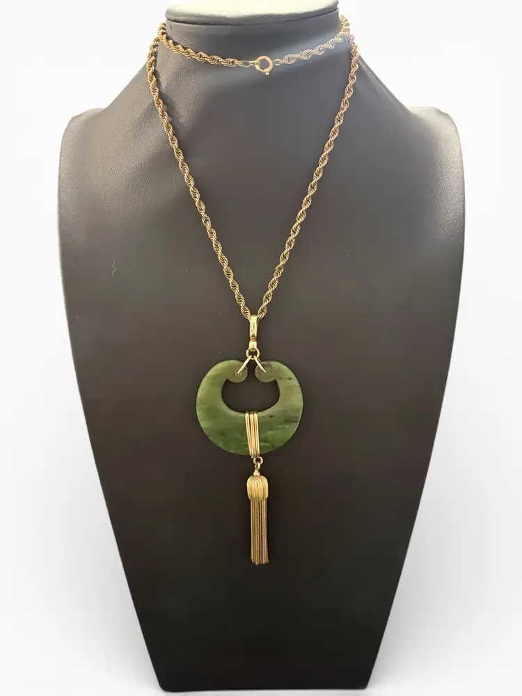 31. Vintage Nephrite Jade Gold Plated Tassel Pendant On 12K GF Chain