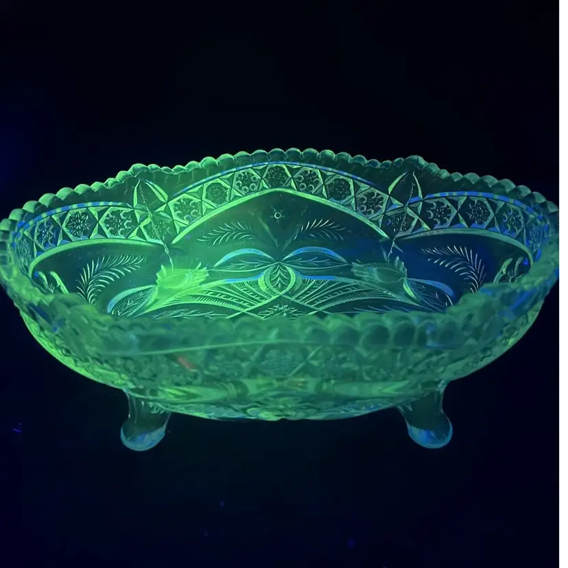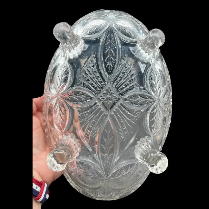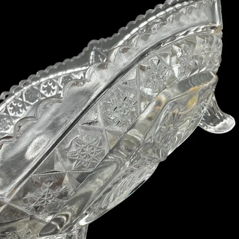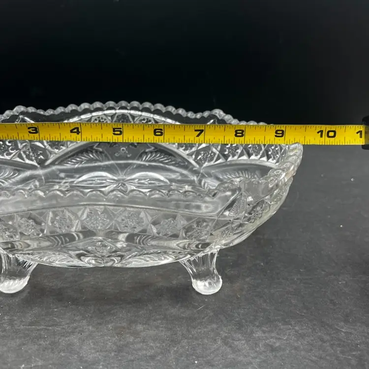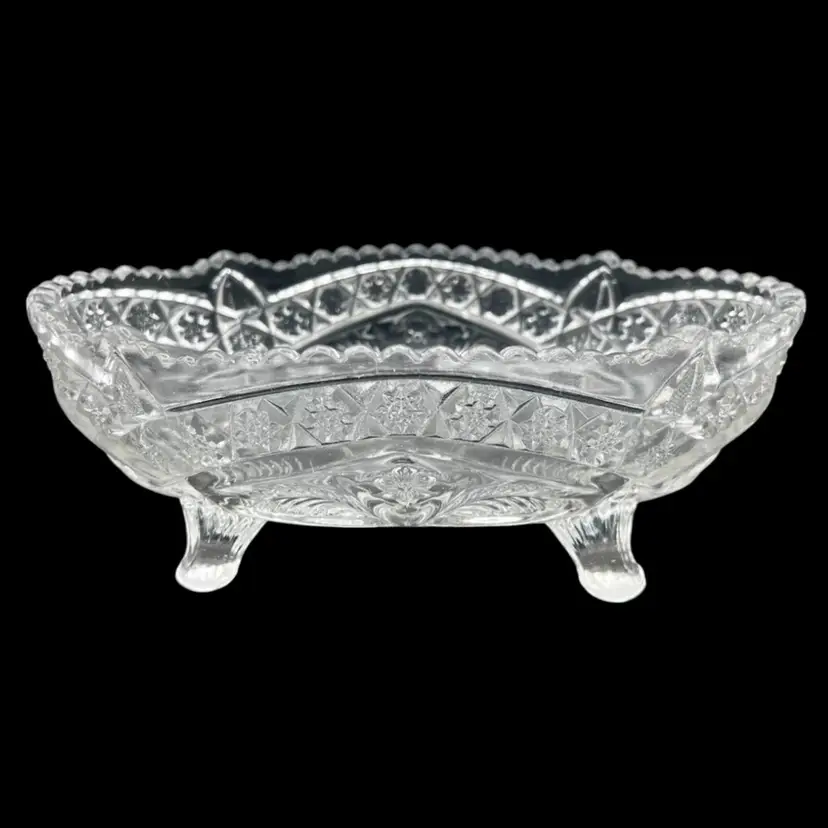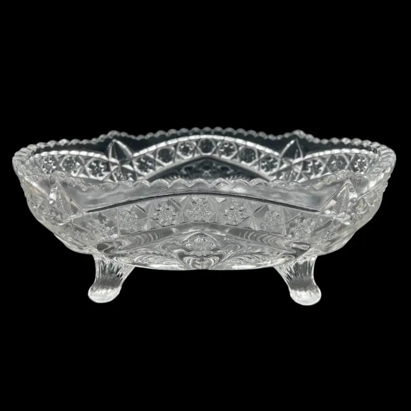 Antique EAPG Indiana Glass Gaelic Pattern 4-Toed Footed Oblong Oval Serving Bowl with UV Uranium Glow In very good condition. One tiny rough spot on the rim - see pictures for details. 3 1/2” tall x 9 1/2” x 6 1/4” Surprising uranium glow