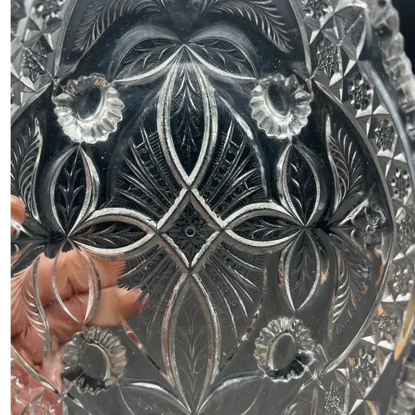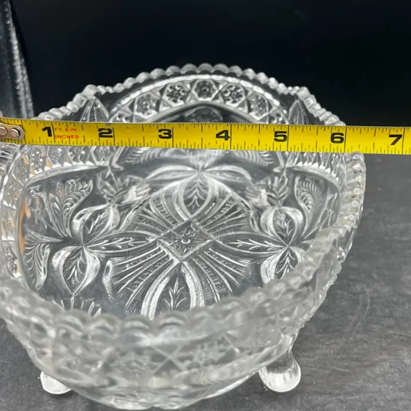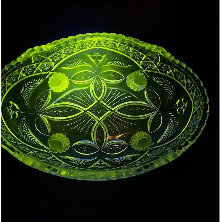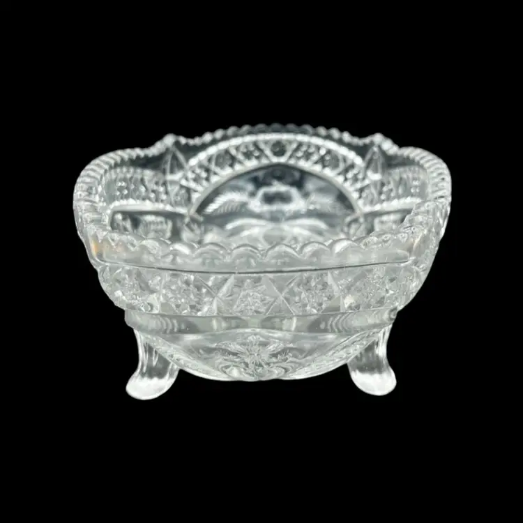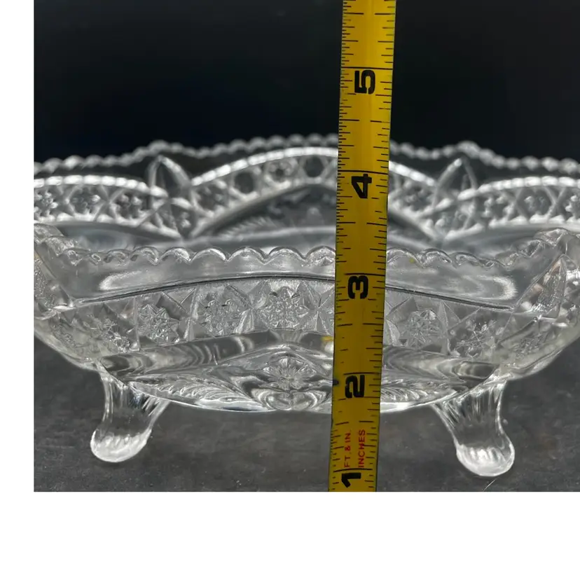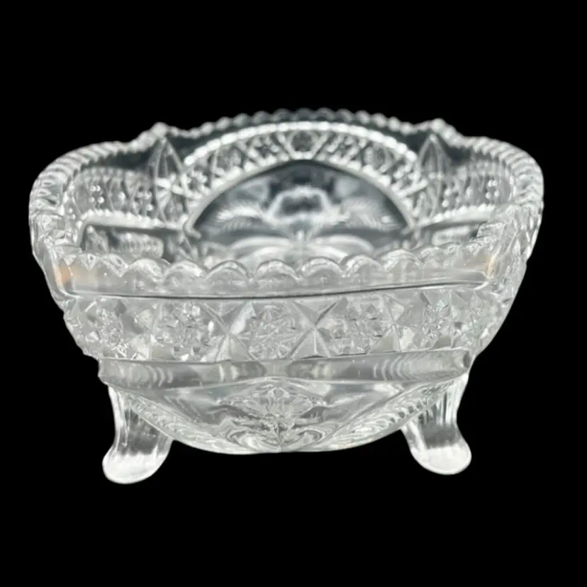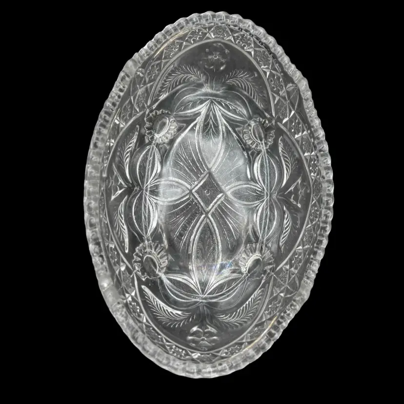 Antique EAPG Indiana Glass Gaelic Pattern 4-Toed Footed Oblong Oval Serving Bowl with UV Uranium Glow In very good condition. One tiny rough spot on the rim - see pictures for details. 3 1/2” tall x 9 1/2” x 6 1/4” Surprising uranium glow