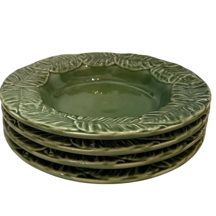 This set of 4 vintage Bordallo Pinheiro soup bowls features a classic green leaf pattern on round ceramic dishes with a glossy finish. Made in Portugal using pottery techniques, these 9" bowls are perfect for serving soups or stews in style. The printed backstamp ensures authenticity, adding a touch of artistry to your table setting. Ideal for collectors or those looking to add a touch of elegance to their dining experience. No chips, cracks or scratches. There is crazing, I believe from storing with too much weight on top. They are new, other than crazing, excellent condition.