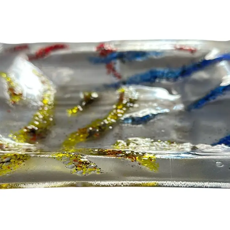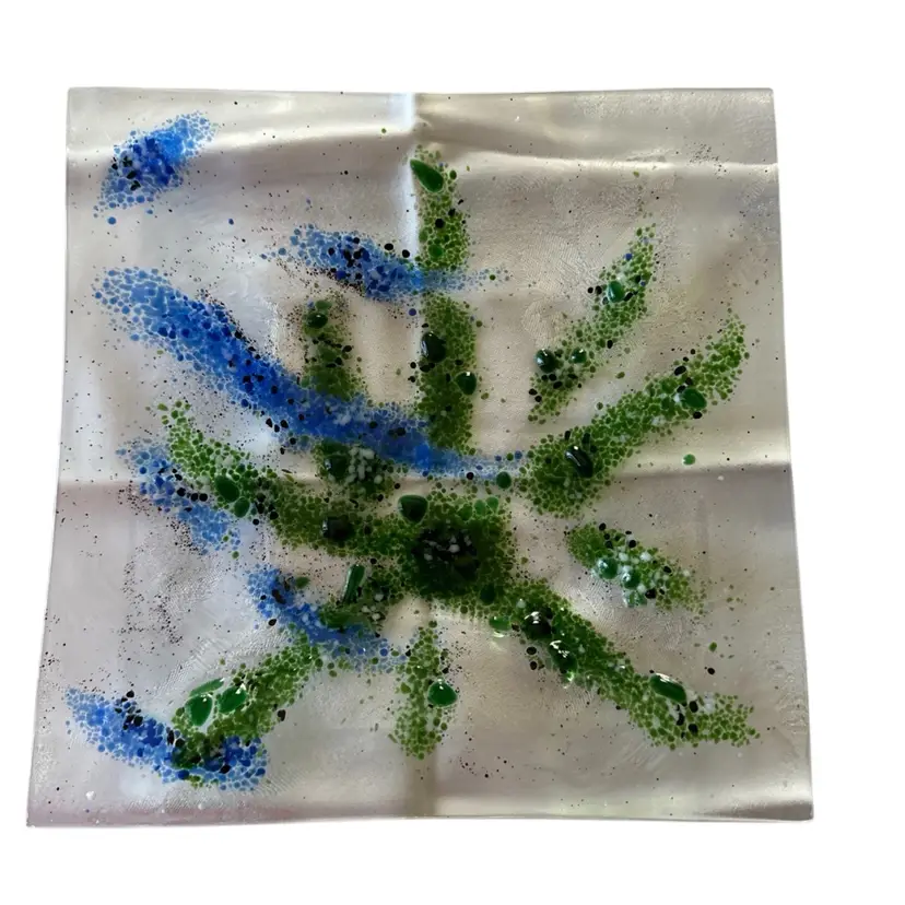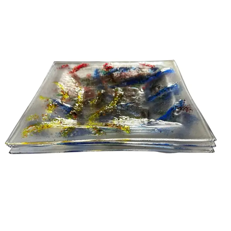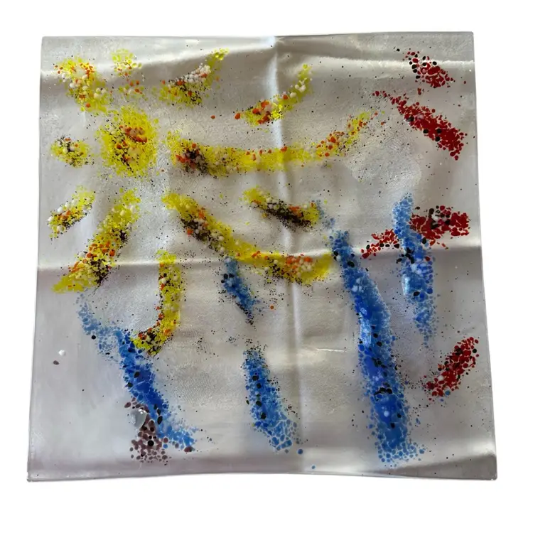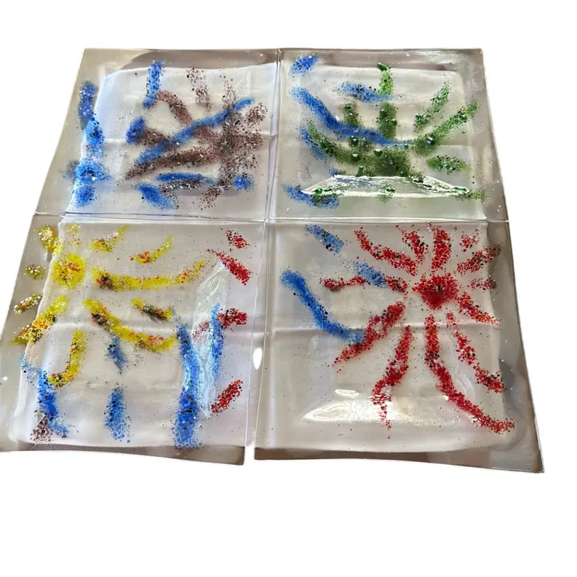 This 4-Fun multi colored fused glass Bowl-Plate set features a unique "Fireworks" pattern in a square shape, making it a standout decorative piece for various occasions such as Mardi Gras, July 4th, and New Year's celebrations. The hand-painted, glossy finish adds a touch of elegance, while the stackable design makes it easy to store . Manufactured using exceptional fused glass technique, these original Bowl-Plates are a vibrant addition to any home decor display. No chips, cracks or scratches. Appear never used.