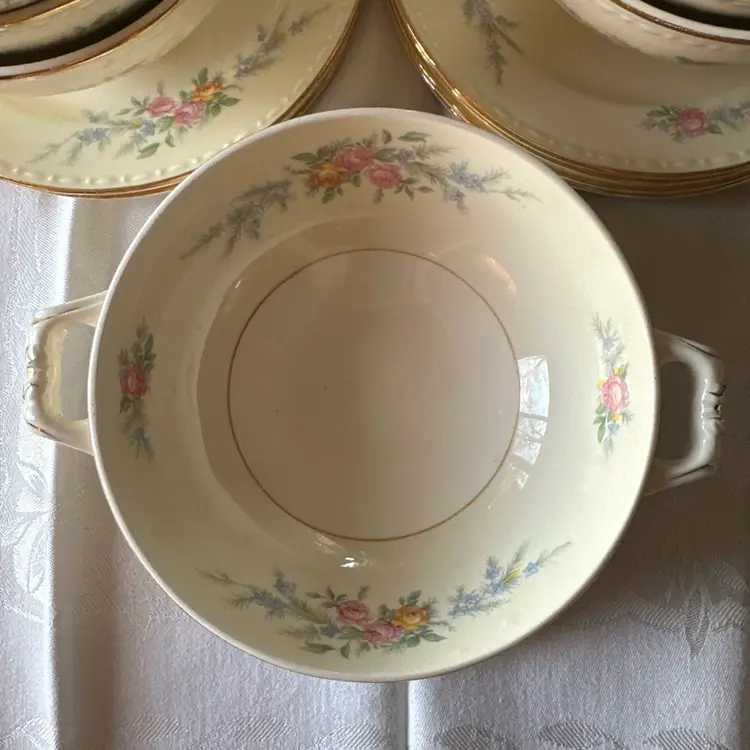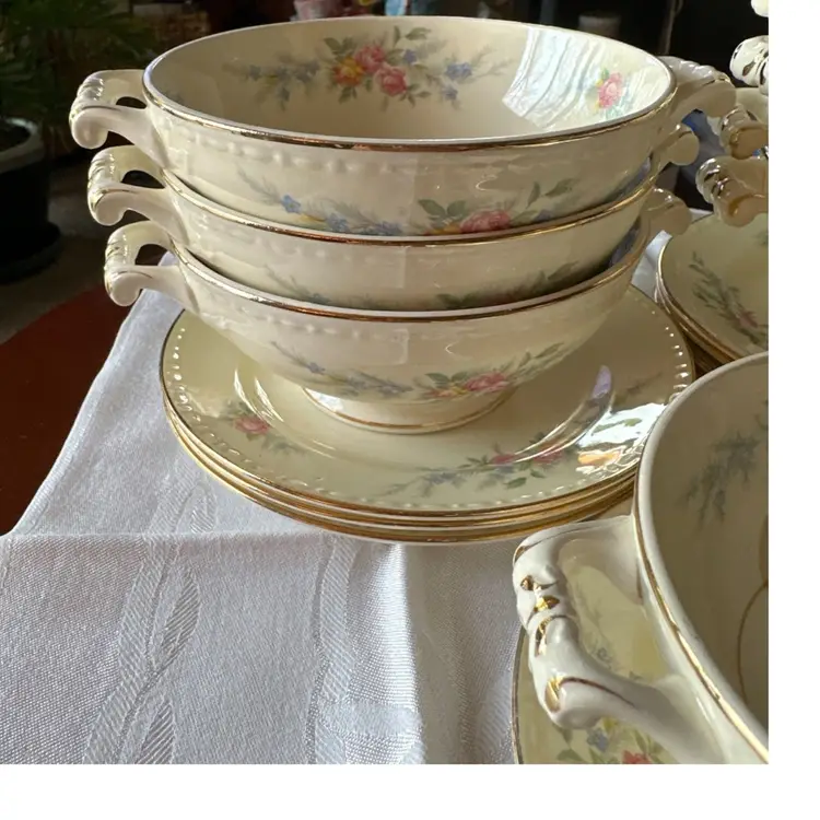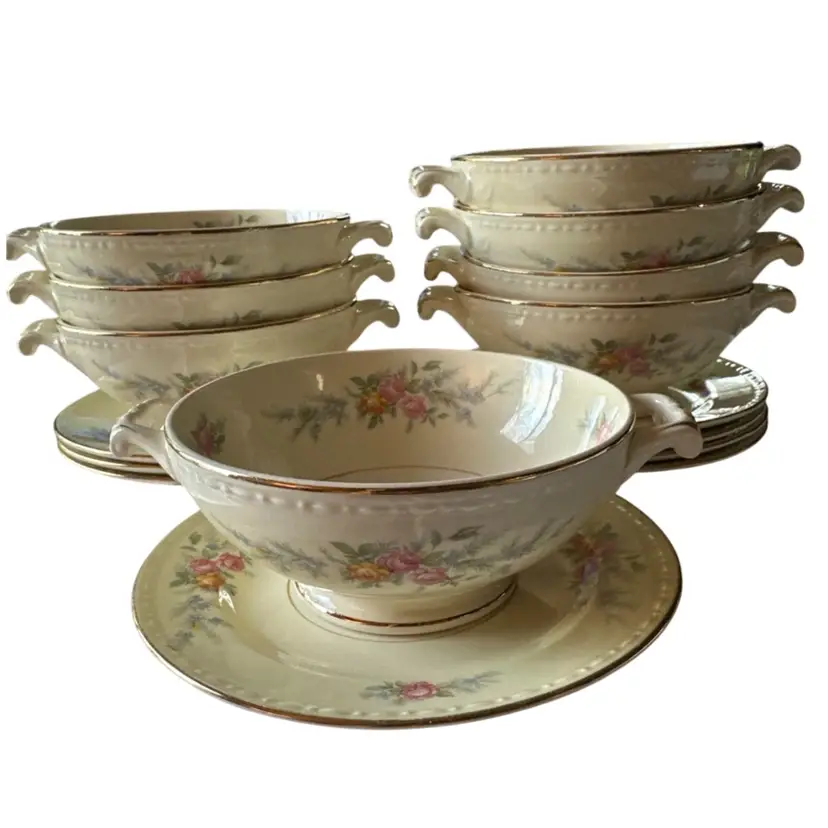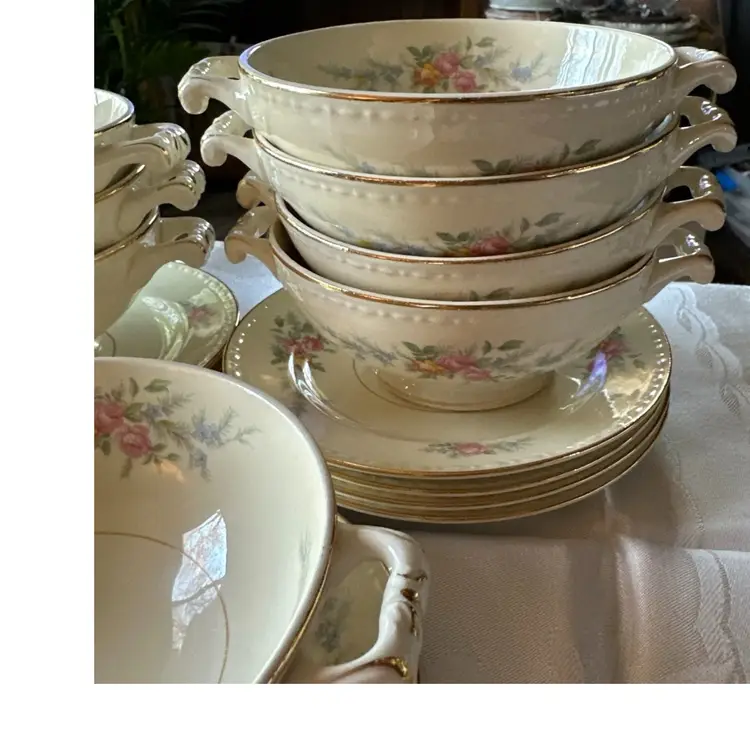 ABSOLUTELY PERFECT! FOUR beautiful and RARE Homer Laughlin Eggshell Georgian Handled Cream Soup Bowls and Saucers in the Cashmere Pattern. Approximately 6 3/8 inches from handle to handle. This listing includes a Set of 4 Soup Bowls with saucers for the price shown... there are 2 sets of 4 bowls with saucers available Very RARE and hard-to-find in any condition and these are Perfect! Just gorgeous! Condition: Excellent Vintage Preowned! Pattern is bold and bright. NO chips, cracks or crazing.