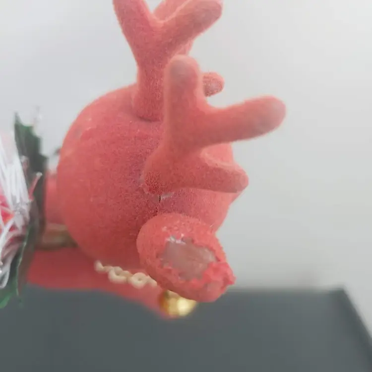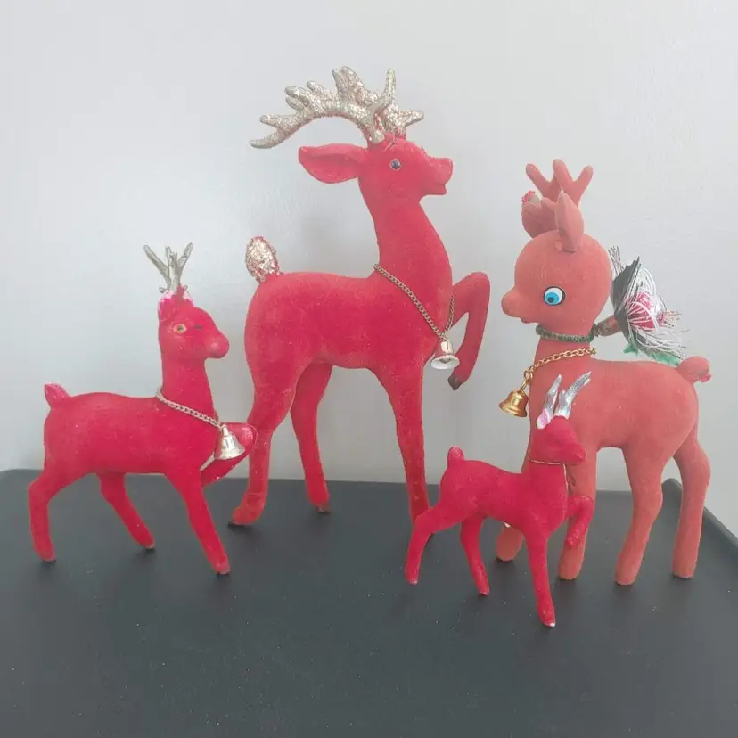One lighter red reindeer with stickers for eyes, gold chain and bell on neck. Ears and antlers wobbly, wear to flocking. Measures 8.5" tall.