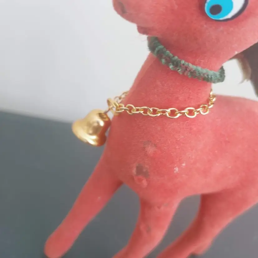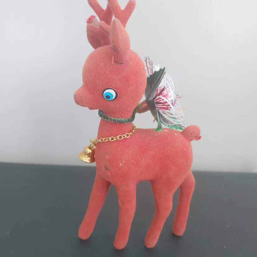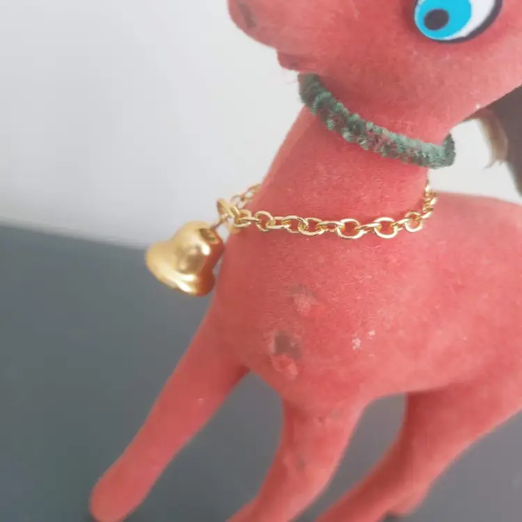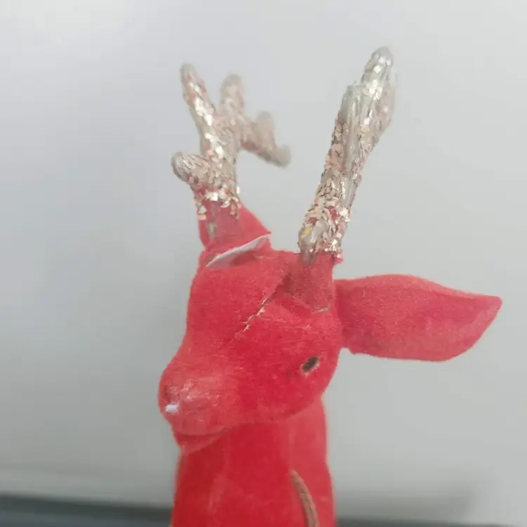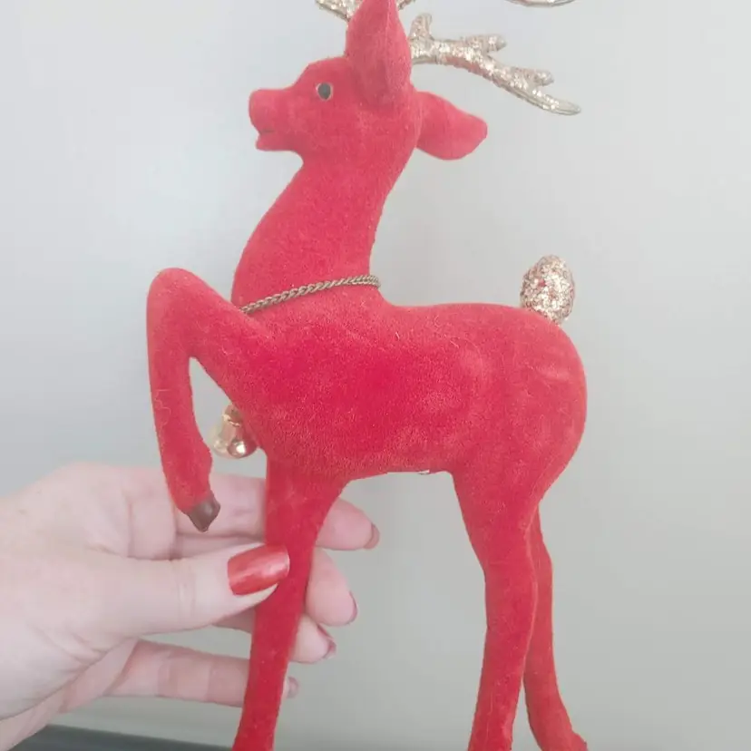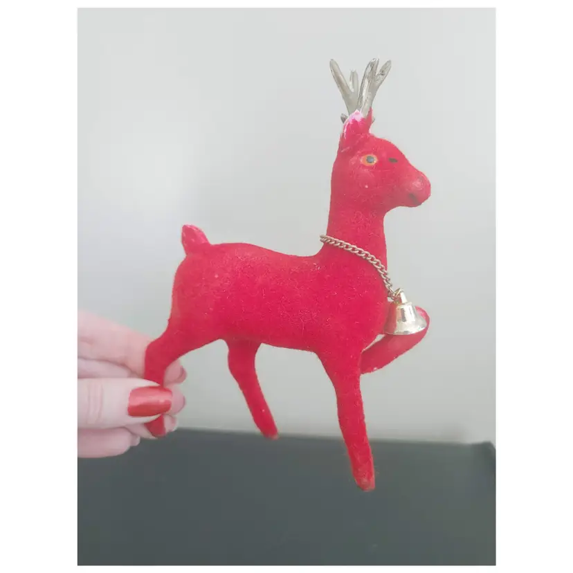 One Small red flocked reindeer with gold painted horns, chain and bell on neck. Wear to flock around ears. Measures 6.5" tall.