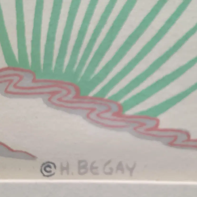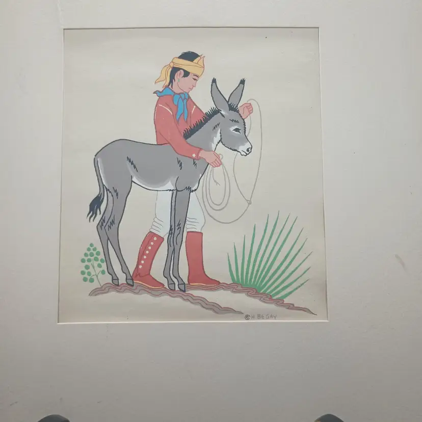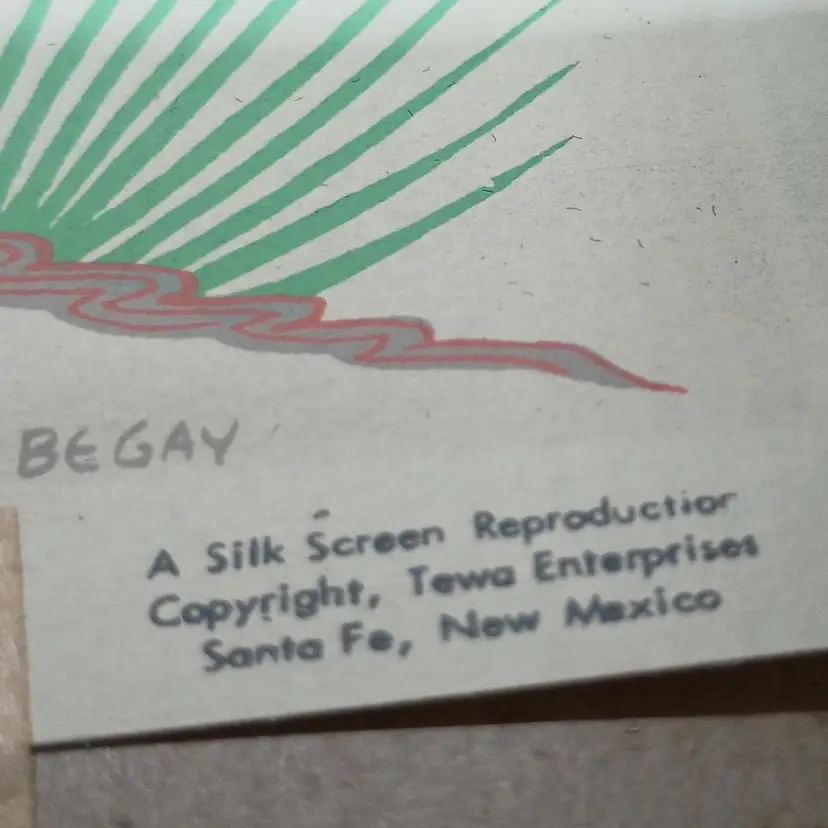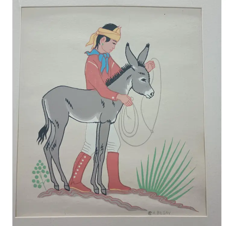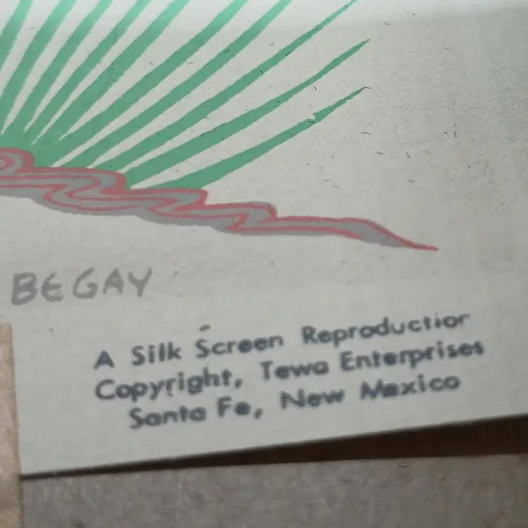 Harrison Begay, also known as Haashke yah Niya(meaning warrior who walked up to his enemy or wandering boy ). ( Nov. 15, 1914 or 1917 - Aug. 18, 2012). Begay specialized in watercolors, gauche and screen silk prints. At the time of his death, he was the last living former student of Dorothy Dunn and Geronima C Montoya at the Santa Fe Indian School. In the mat this picture measures approximately 9 3/4 by 10 1/2 inches.