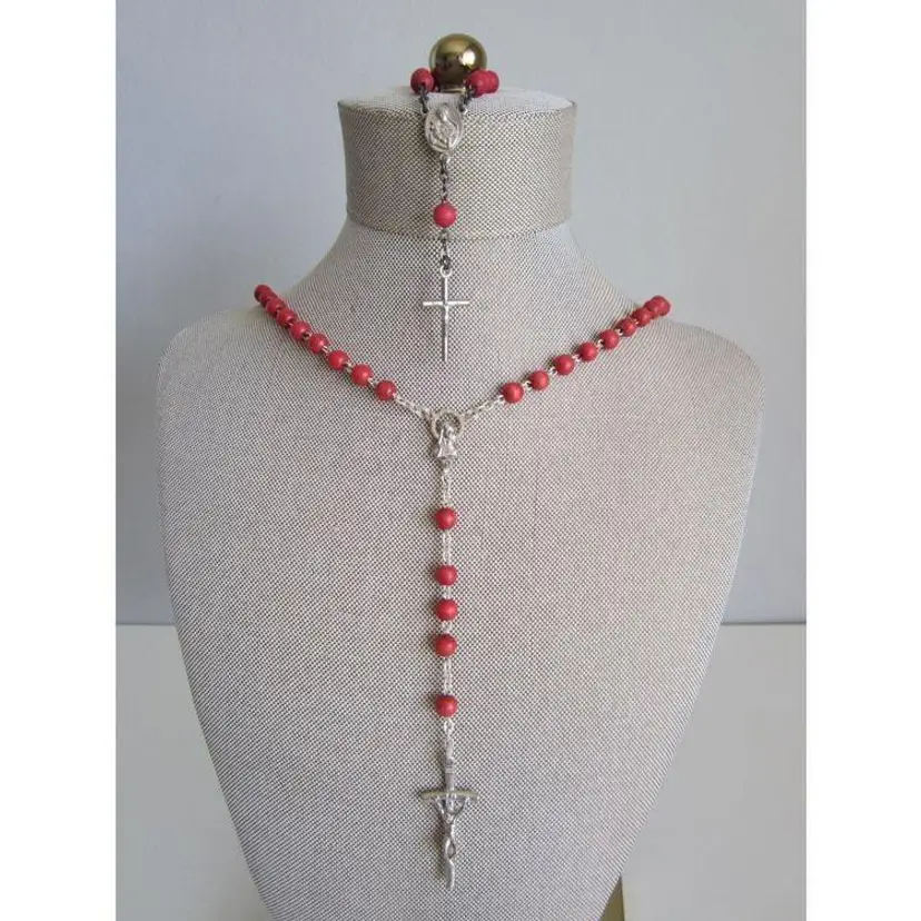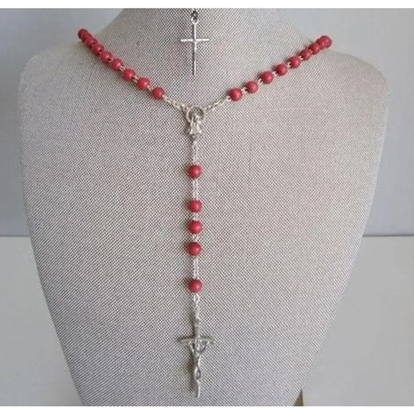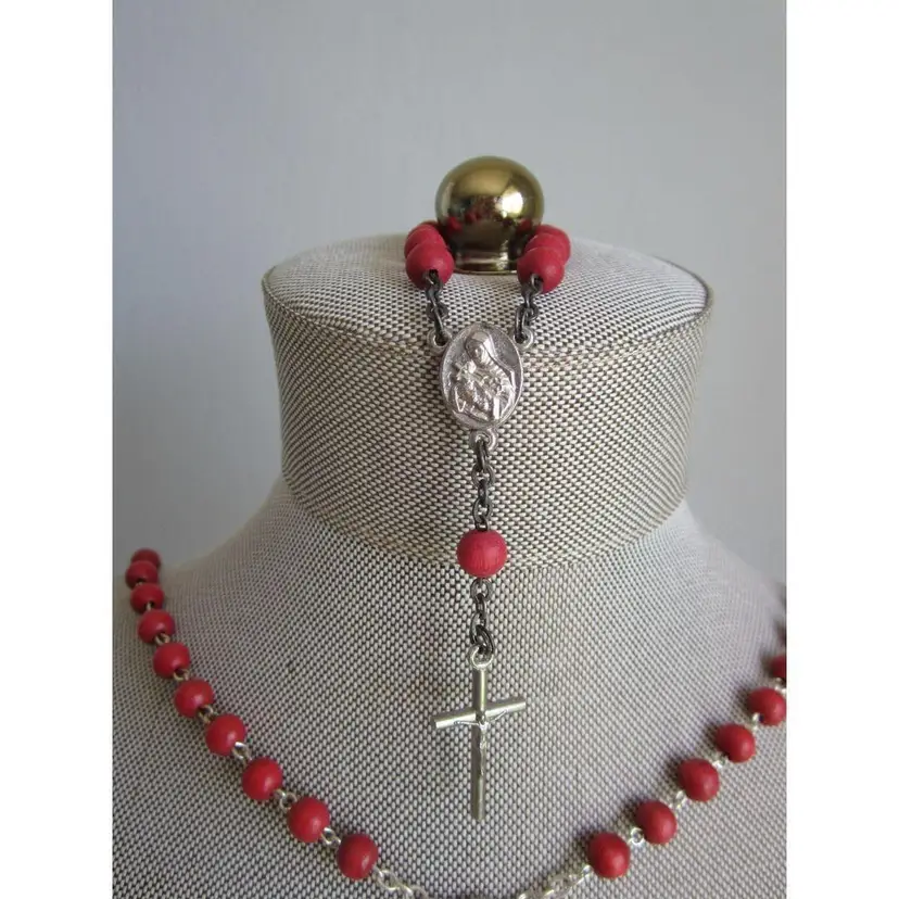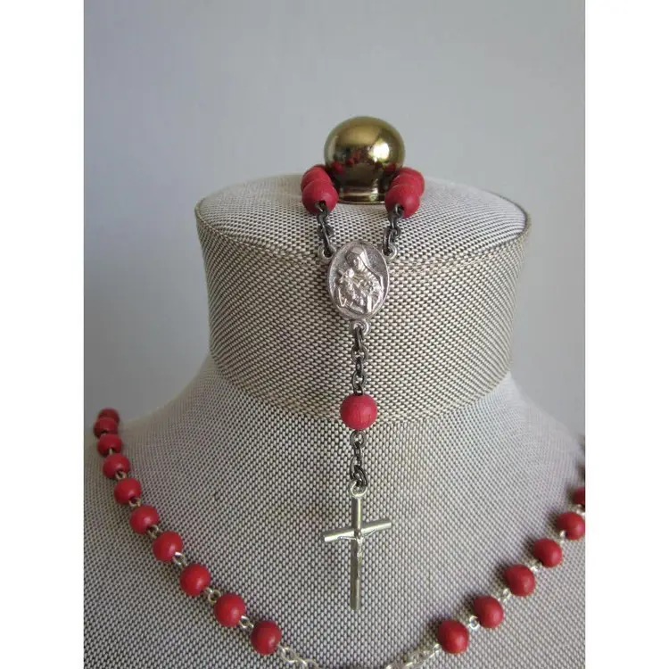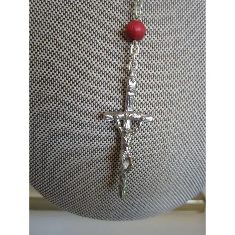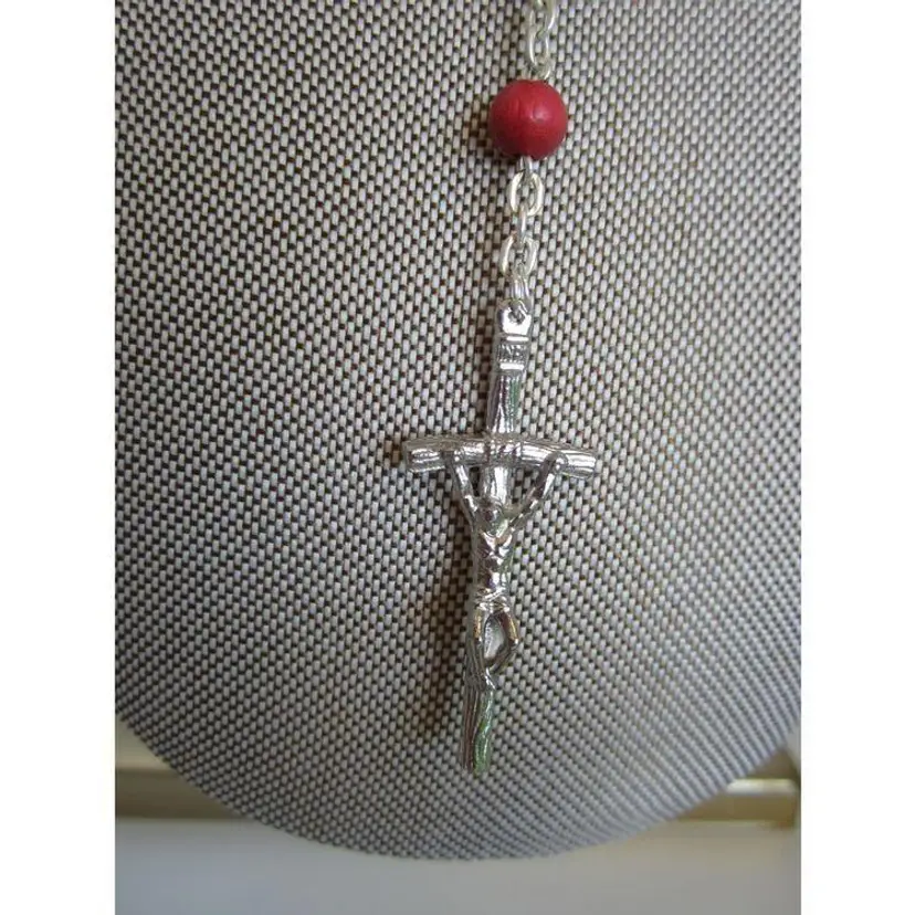 Vintage Rosary necklace with cherry red wood beads. Silver crucifix. 1 5/8" length. This rosary also comes with a matching rosary tenner!