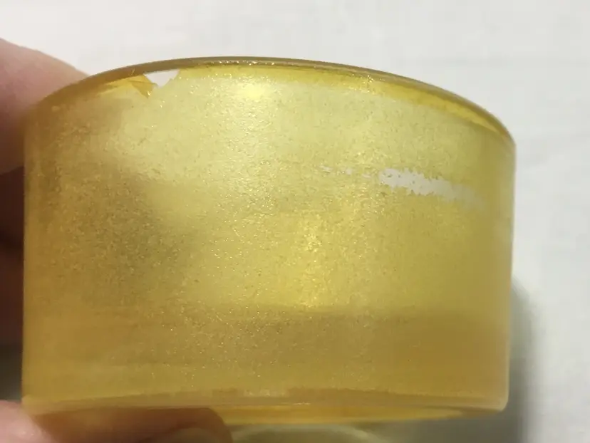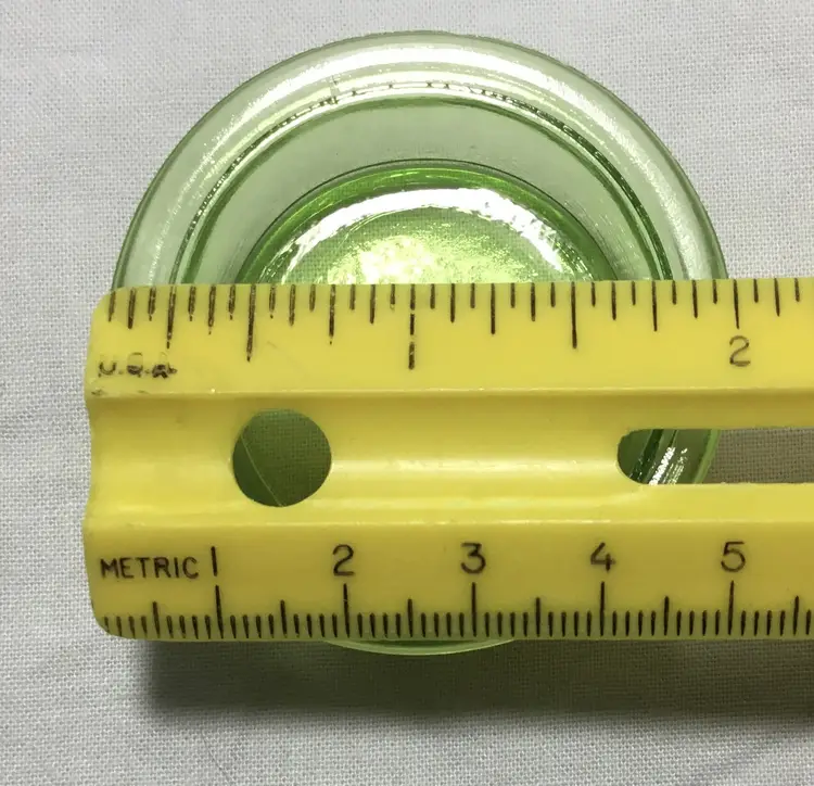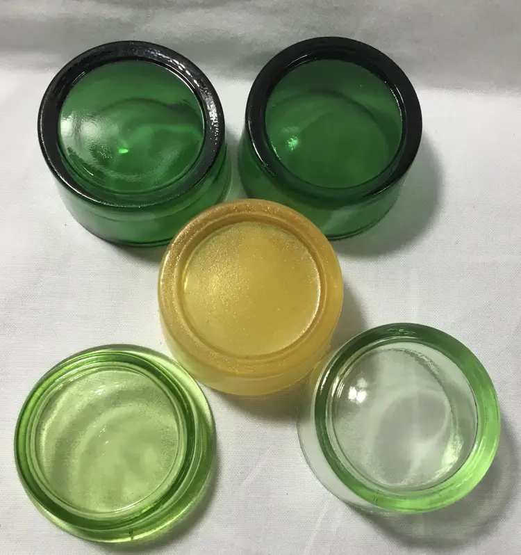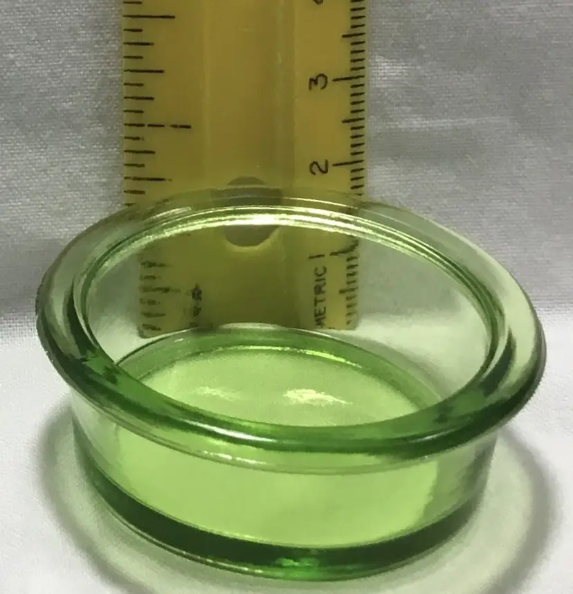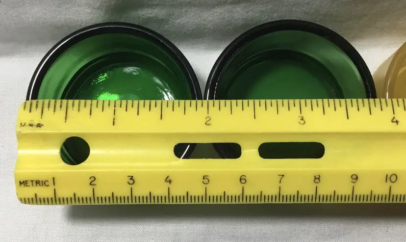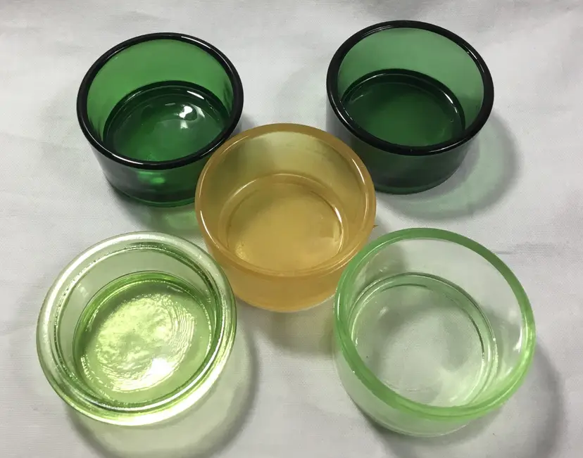 Lot of 5 tea light holders, 2 dark green, 2 pale green, 1 yellow. Green ones are colored glass, yellow has flashed on color which has a scratch and a nick. (See photos) One of the pale green holders is shorter than the others at 3/4 inch and has a rim. Others are 1 inch tall. All are approx. 2 inches wide. No chips or cracks.
