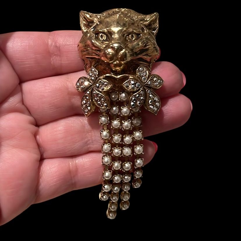 58. Rare Signed KIRKS FOLLY Faux Pearl Marcasite Kitty Brooch Pin~Limited Edition