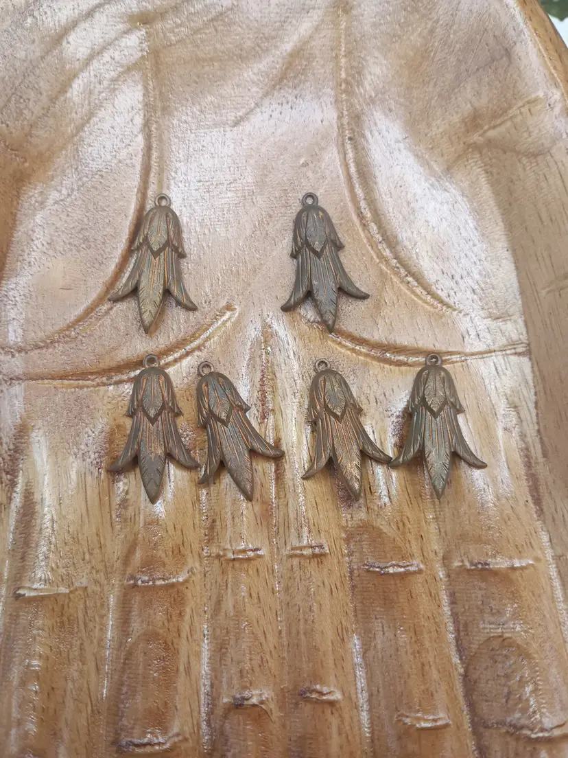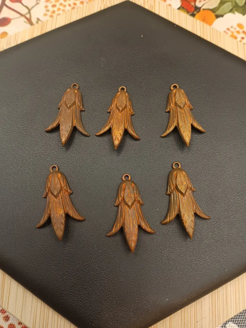 In this lot you will receive 6 vintage copper pendants. They have a squash blossom floral motif. They measure approximately 1 inch. They are from the the estate of Ann Vien. She was a costume jewelry designer in Atlanta during the 1940/50s. Larger quantities available.