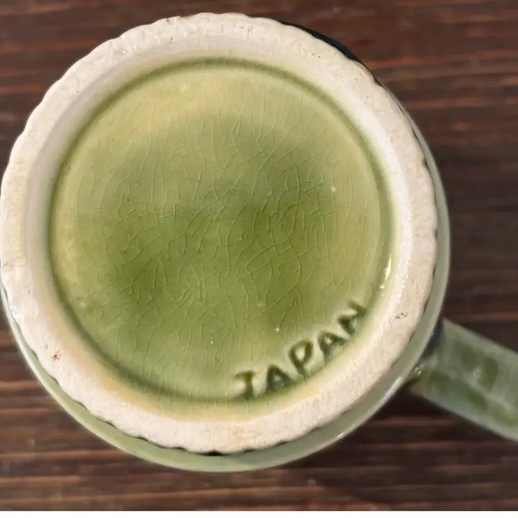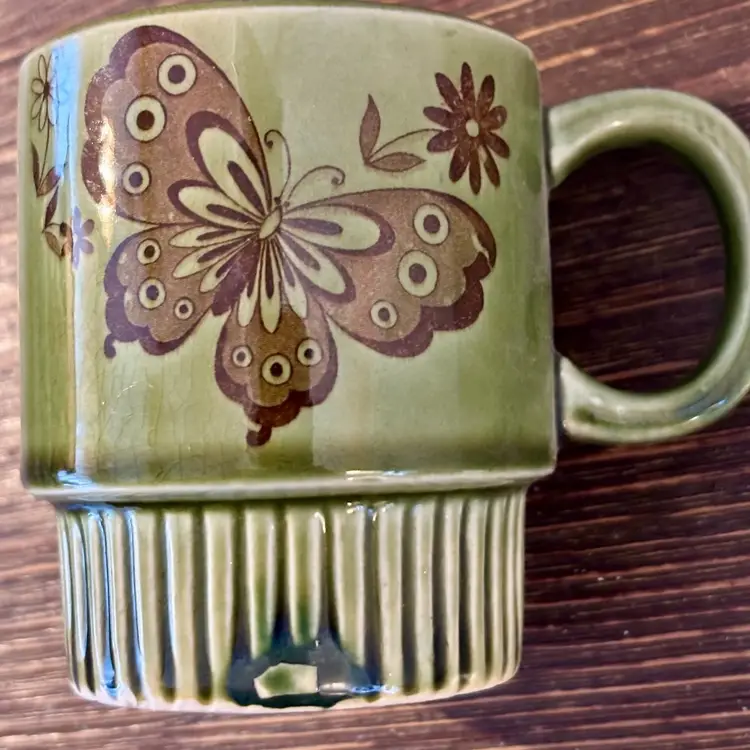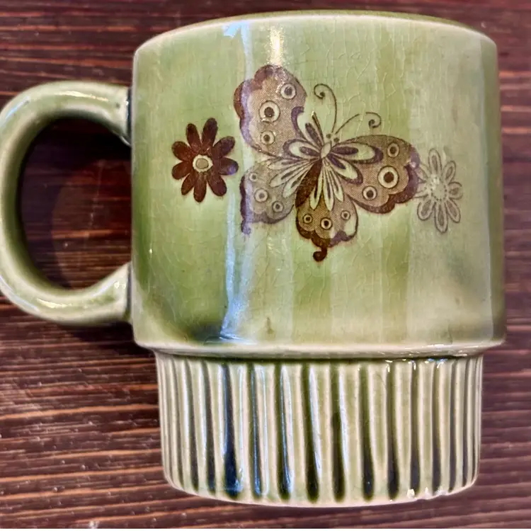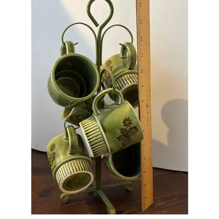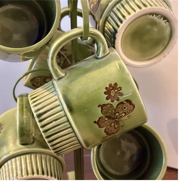 Vintage set of 6 MCM (Mid-Century Modern) green ceramic mugs with a brown butterfly and flower design and metal holder Japan on bottom of each cup Distinctive ribbed, stackable base From the 1960-70’s No chips or cracks that I can see or feel