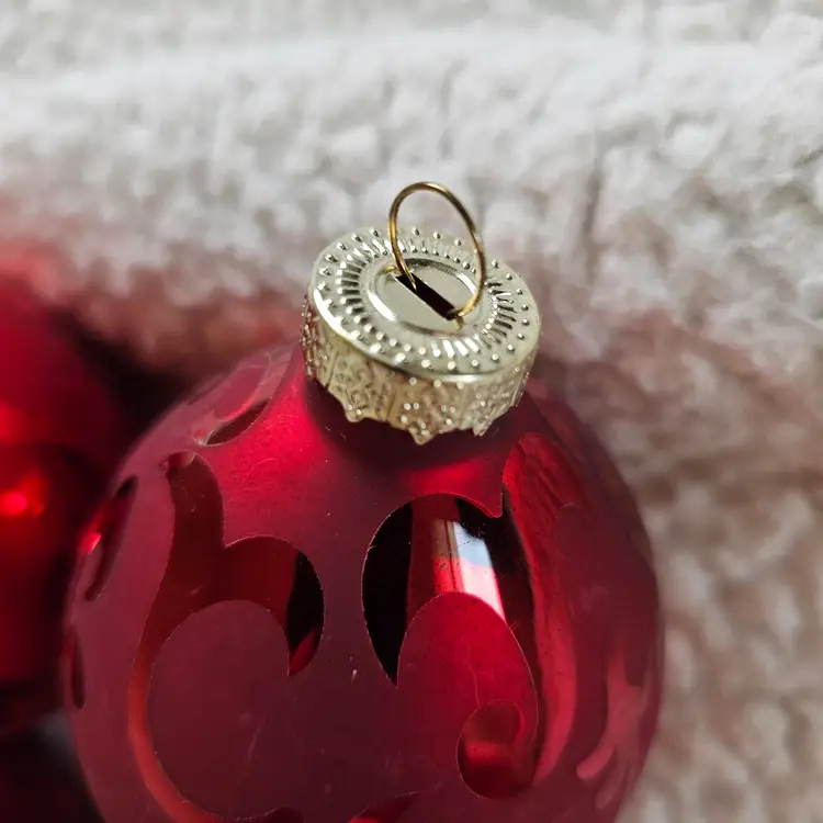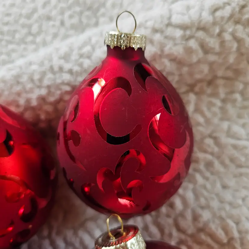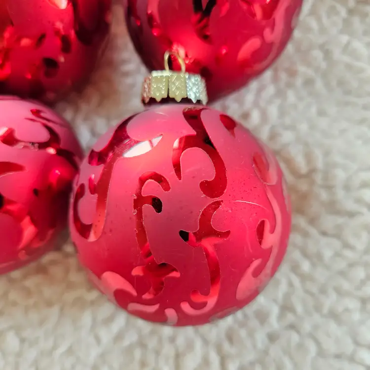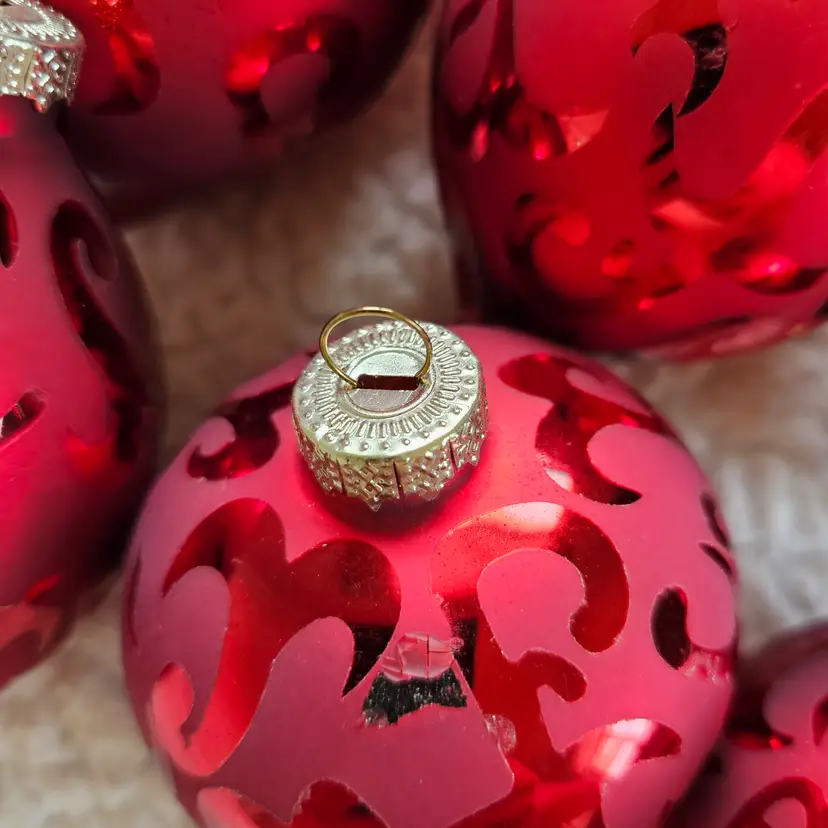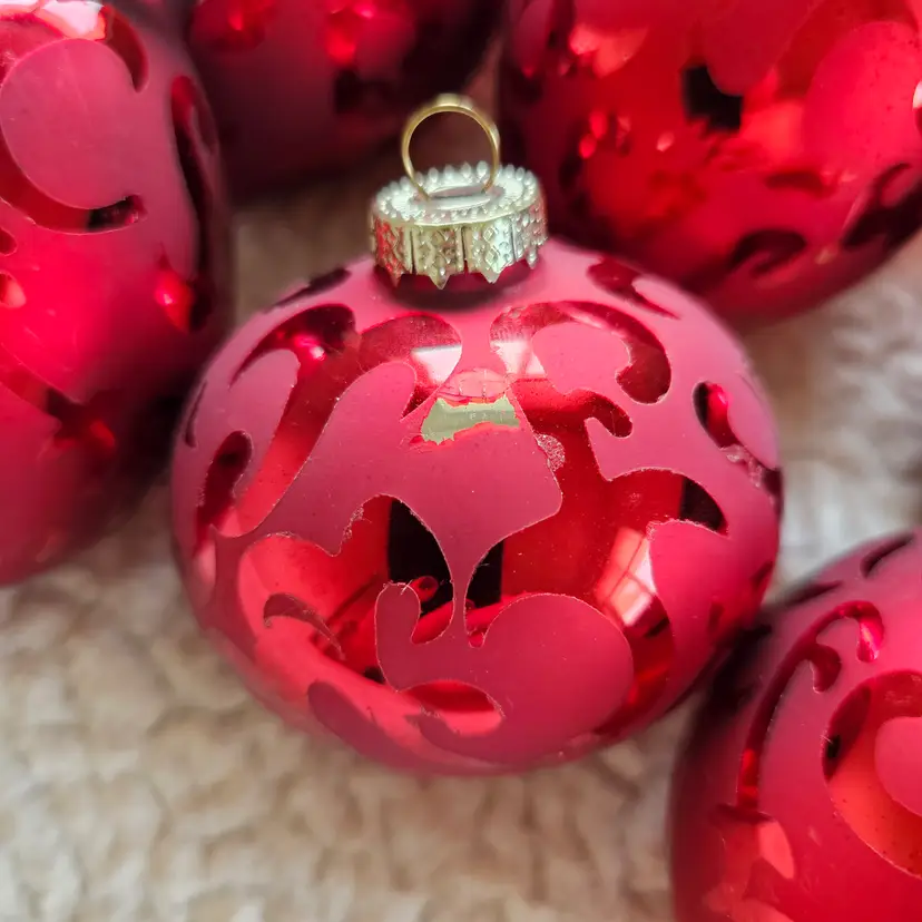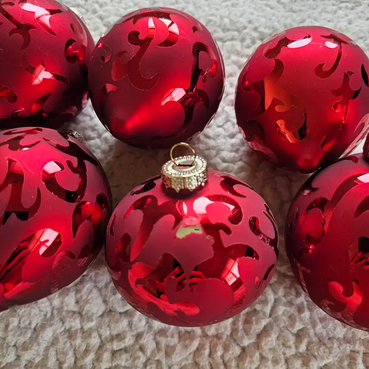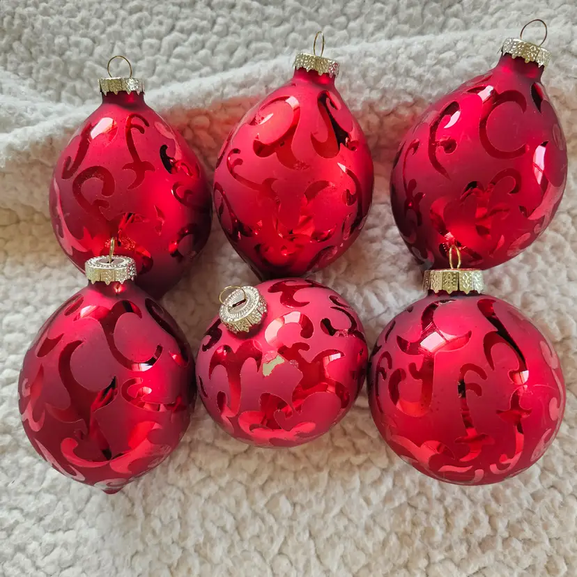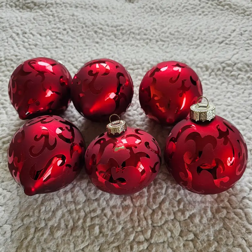 The product is a set of 6 red frosted floral glass 3" ball Christmas ornaments. These ornaments are perfect for the holiday season, with a festive ruby red color and a round teardrop shape. Made of glass, they add a touch of elegance and sparkle to any Christmas tree. The floral pattern and Christmas theme make them a charming addition to any ornament collection. The set includes 6 ornaments, each beautifully crafted to bring a bit of holiday cheer into your home.