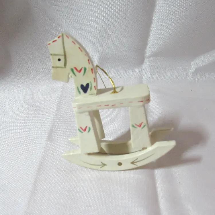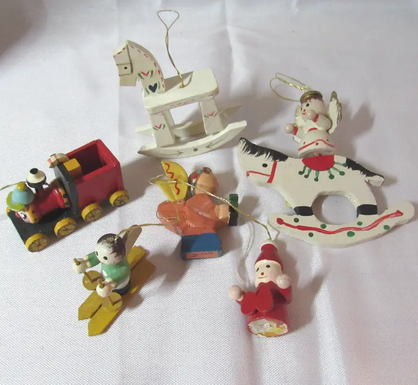 Each was gently used each year on our Christmas tree Angel on rocking horse - 3.5" x 3.5" Rocking Horse - 2.5" x 2.75" Train - 1.5" x 2" Skiing Angel1 5/8" x 1.75" Santa - 1.75" x 1" Angel - 2" x 1.5"