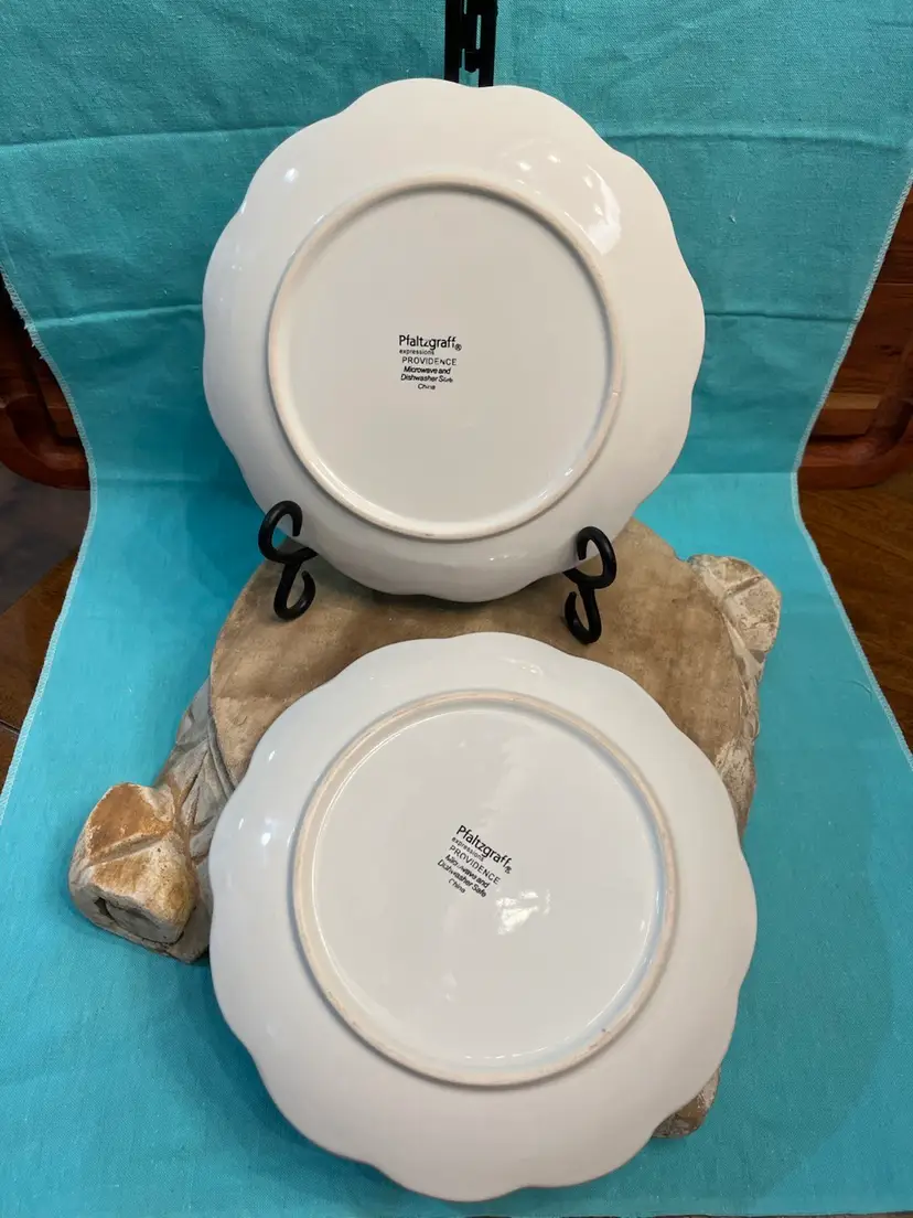 #818 8” Pfaltzgraff Expressions Providence Salad Plates- White Set Of 2 No chips or cracks, one has a couple slight wear marks as seen in 3rd photo.