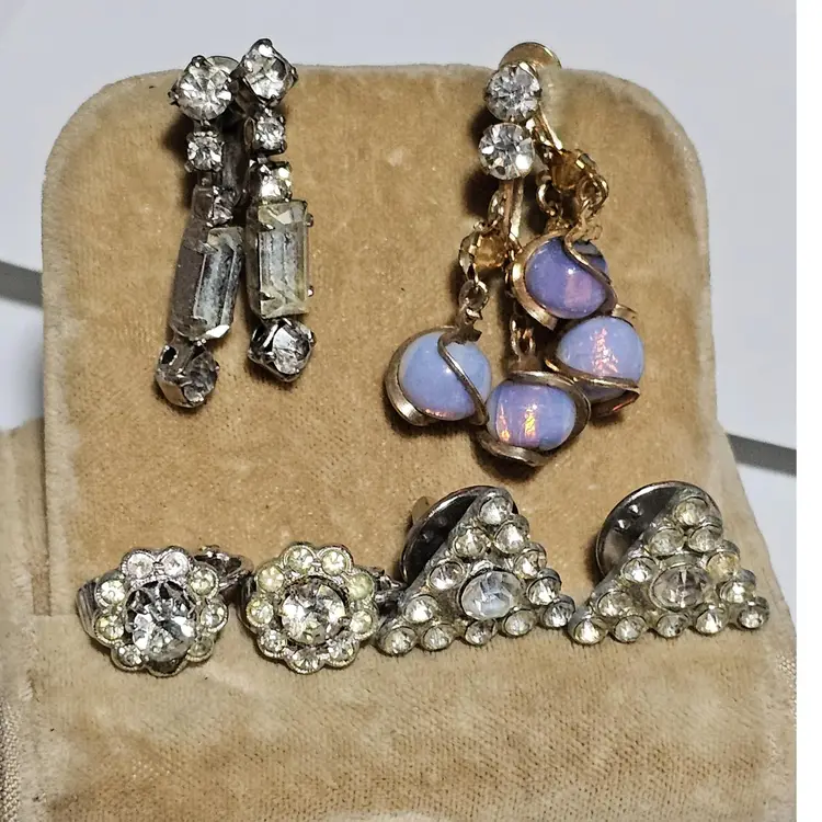Getting 5 pairs of earrings, 3 Adjustable Necklaces, 1 pair triangle Lapal pins. Non of these items are signed. If you have any questions please feel free to message me in the chat!!!