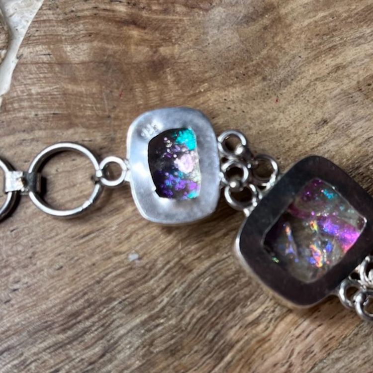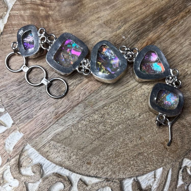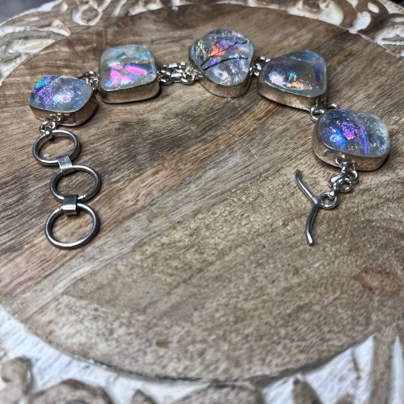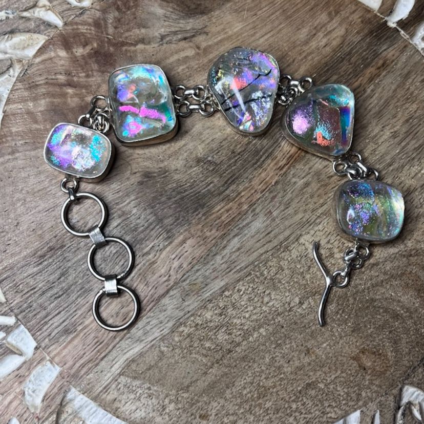 Gorgeous opalescent dichroic glass adorning a charming silver toggle bracelet.