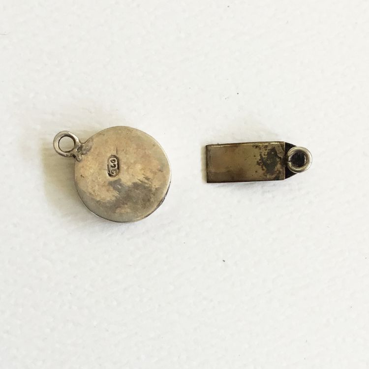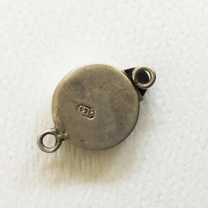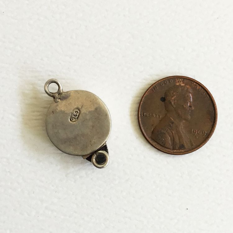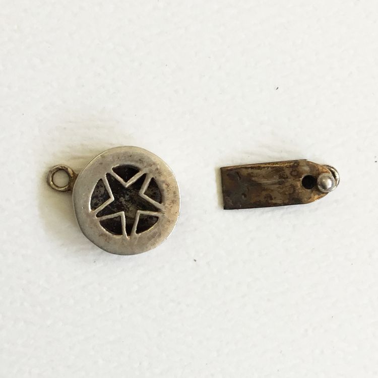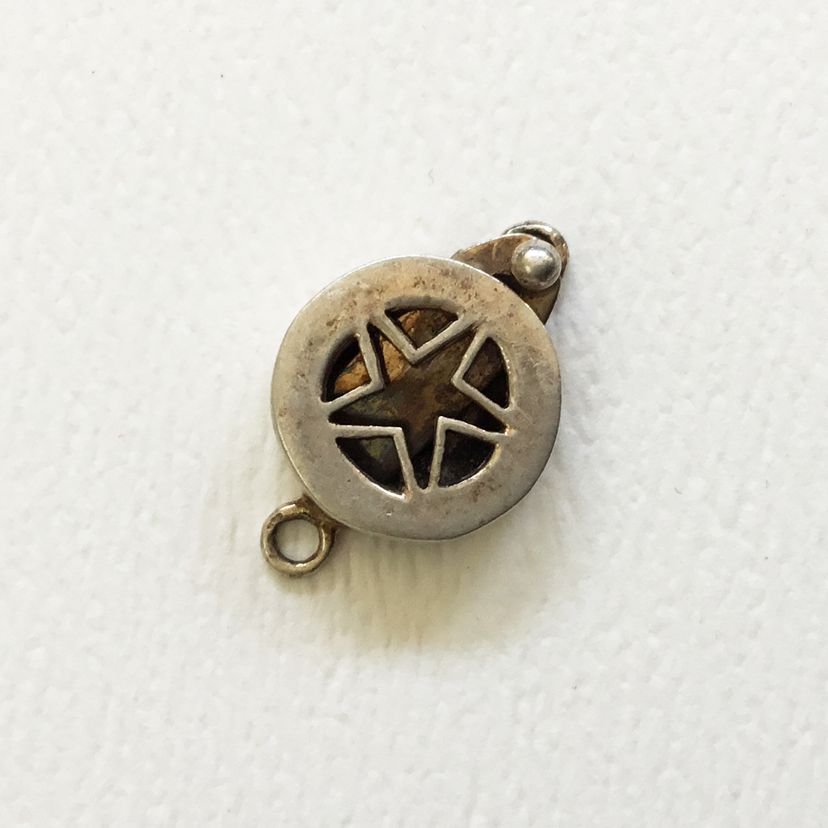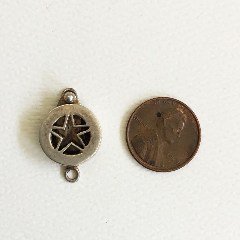 This is a round sterling silver box clasp that features a cutout star design. This is for a single strand piece of jewelry. Marked the on the back and acid tested for sterling silver.