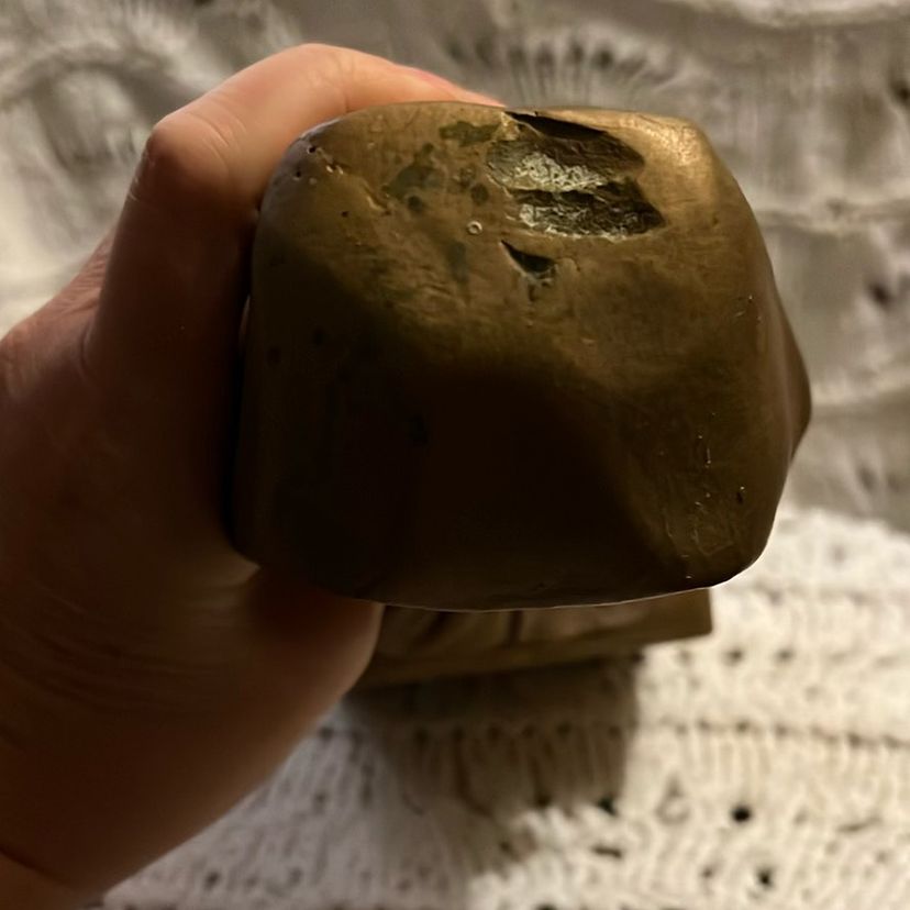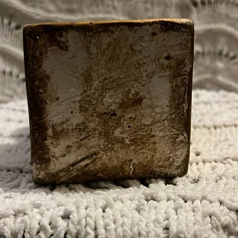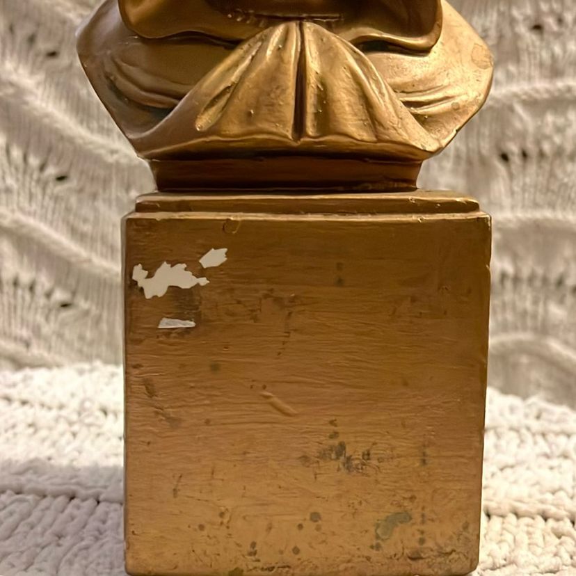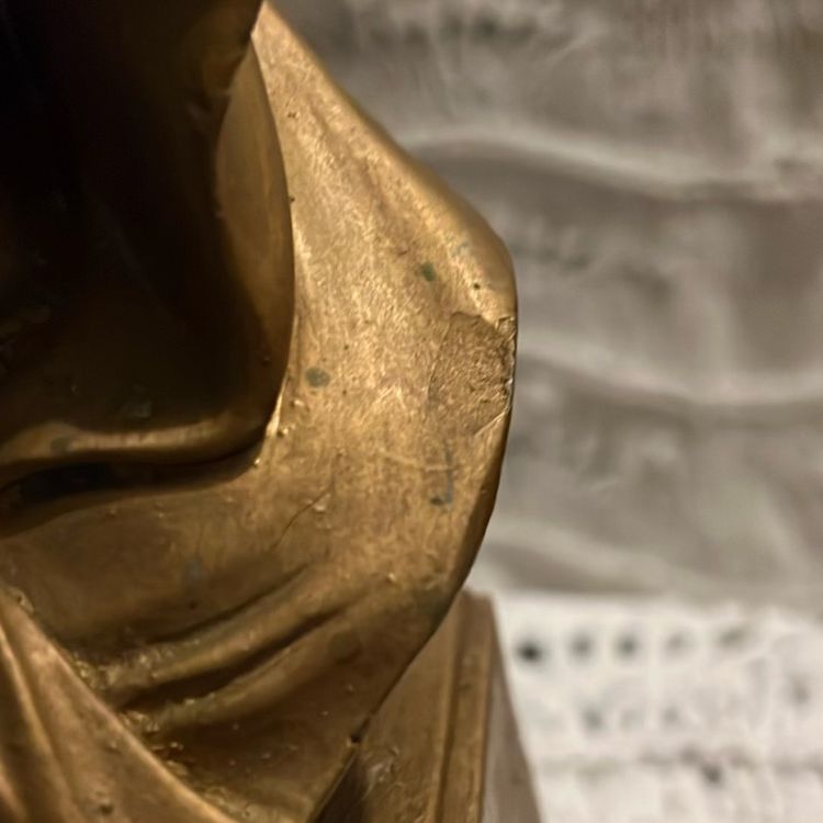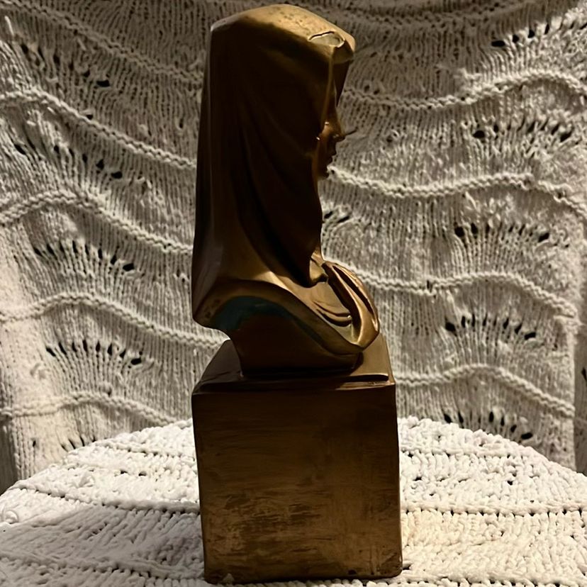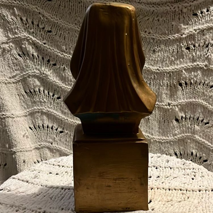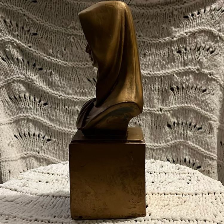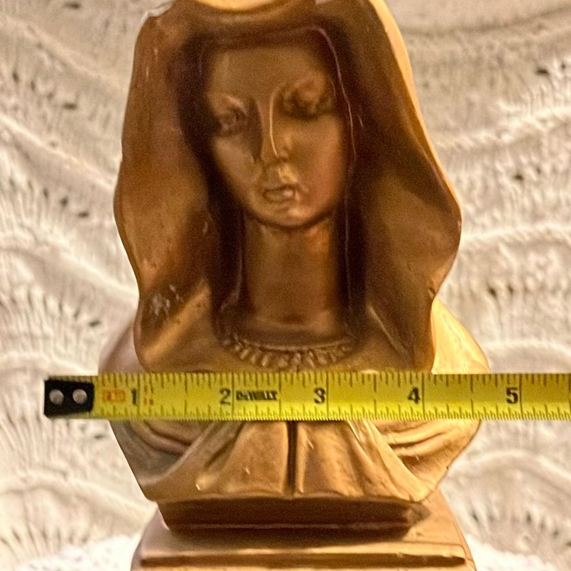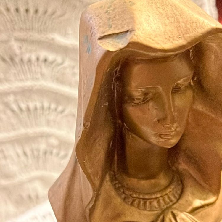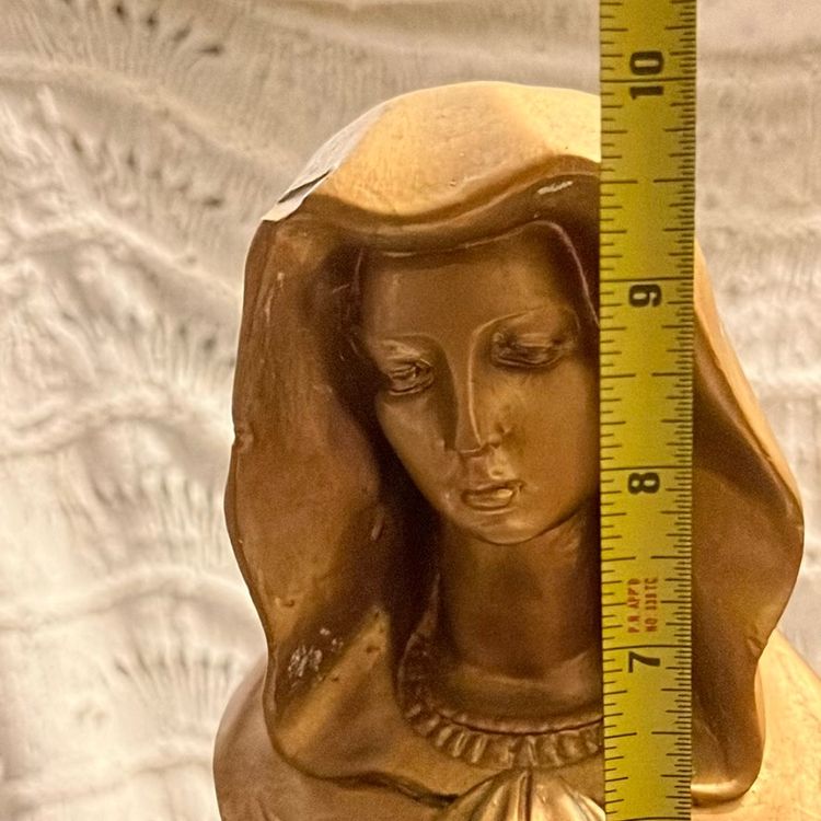 A bust of the Virgin Mary. This type of statue, often referred to as a Madonna bust, is a common religious item. She weighs 3 lbs. 13 oz. is made of some sort of cement or heavy material. She stands 10 1/2 inches tall and 5 inches wide with the depth of 4 inches. The style is reminiscent of a "Sorrowful Mary" or "Our Lady of Sorrows," depicting a pensive or mournful expression. This statue has some dings, but makes it even more unique.